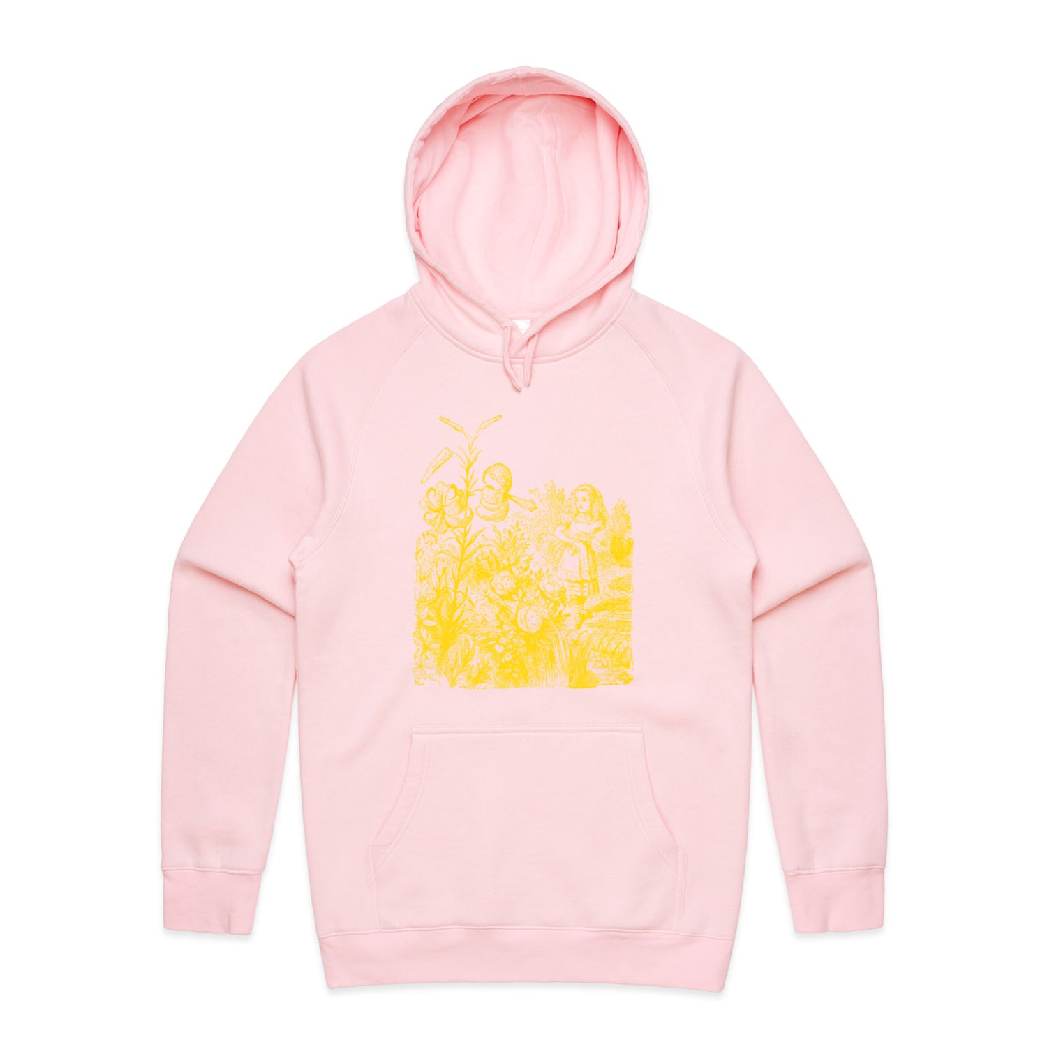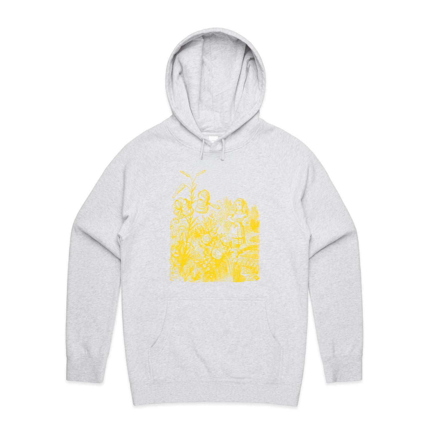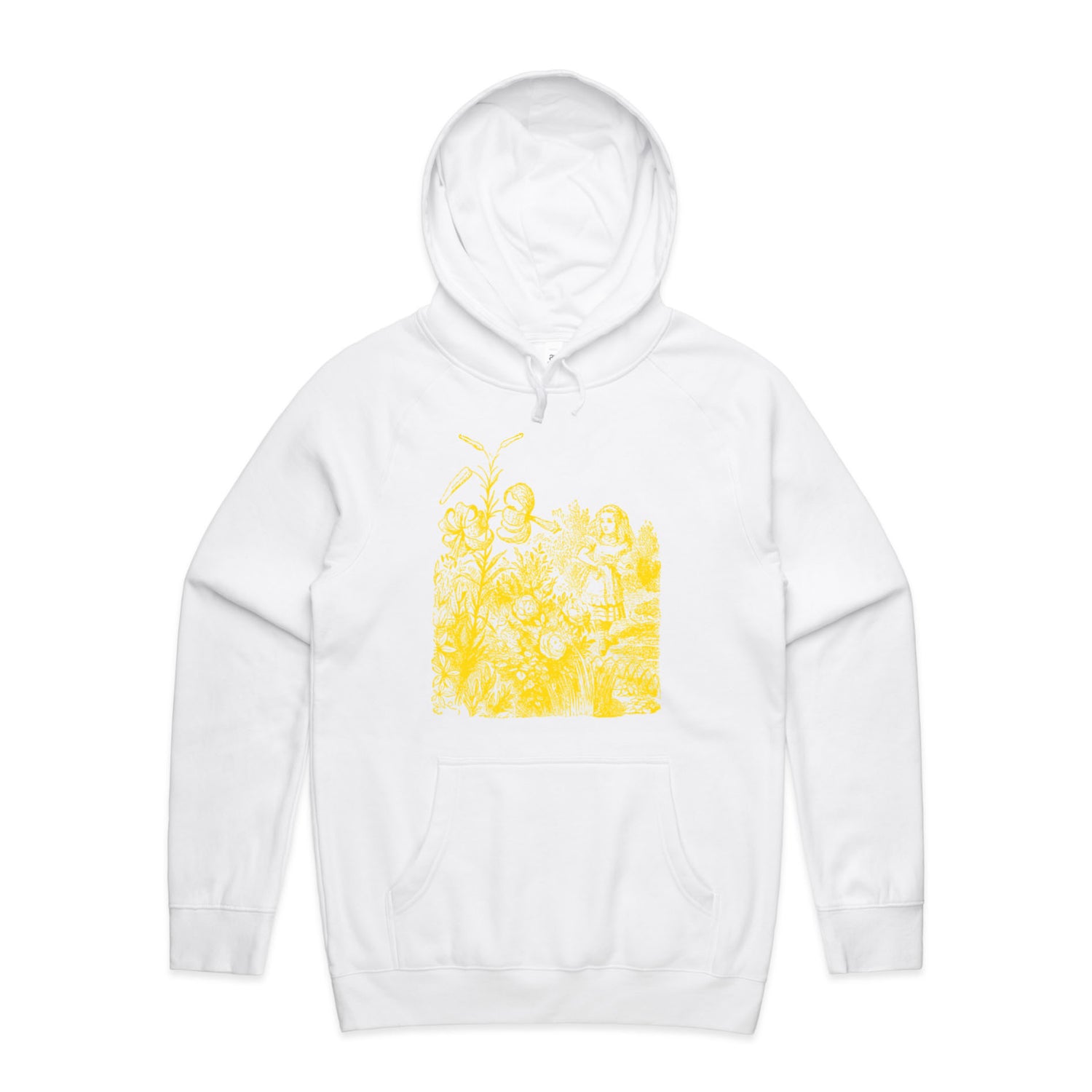 The Hoodies Alice in Wonderland - Garden of Live Flowers – Men's Hooded Sweatshirt is a high-quality men's hooded sweatshirt, printed with yellow ink on the trusted AS Colour Supply Hood 5101. With a regular fit and mid-weight feel, it's crafted from a premium blend of 80% cotton and 20% polyester anti-pill fleece, making it a durable and comfortable staple for any wardrobe. The pullover design features raglan sleeves, a lined hood with tonal drawcord, ribbed sleeve cuffs, and a roomy kangaroo pocket — all designed to keep you warm while looking effortlessly sharp.