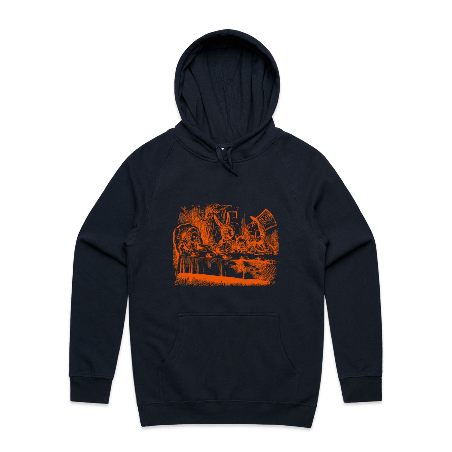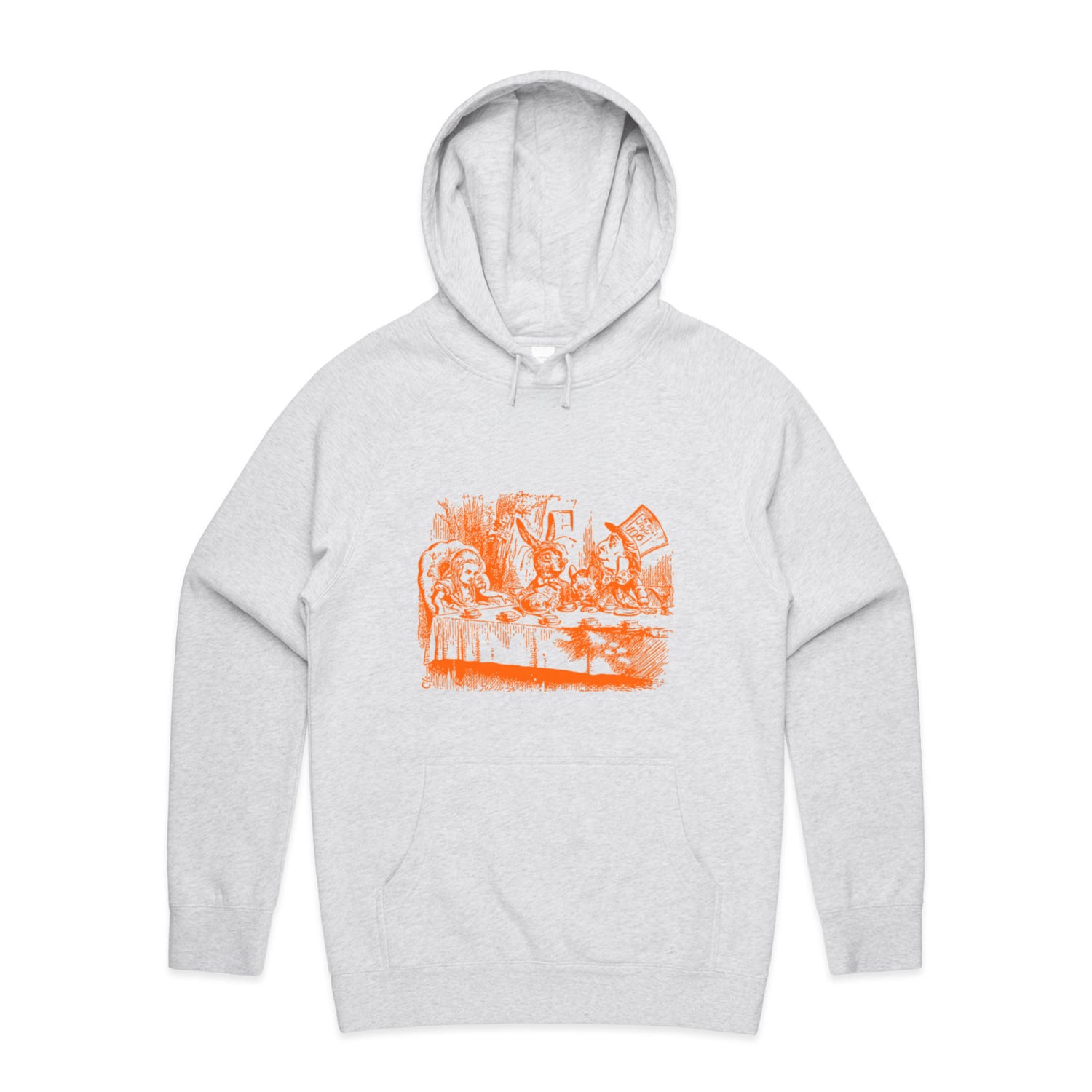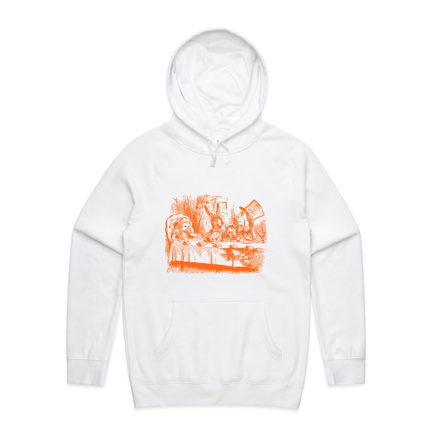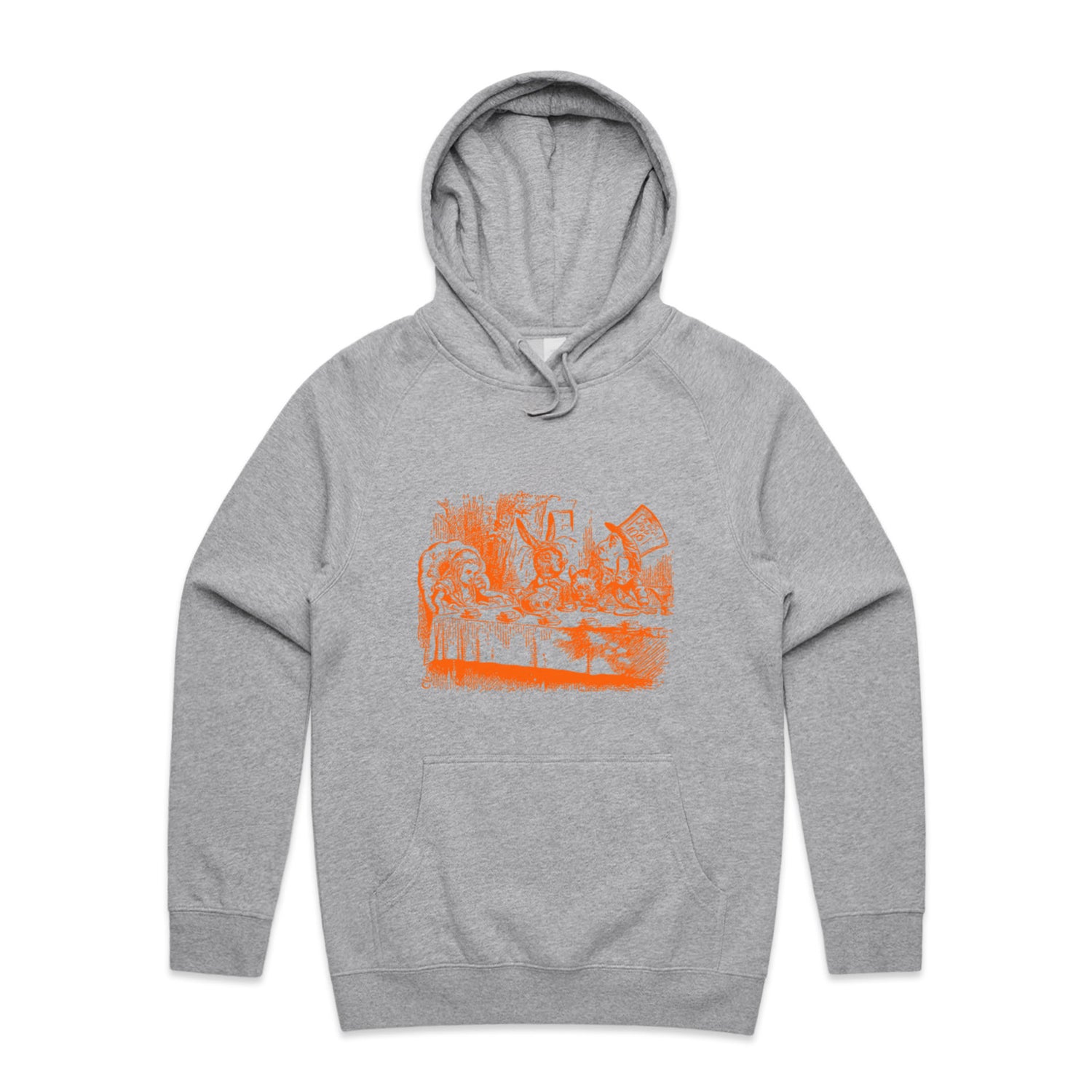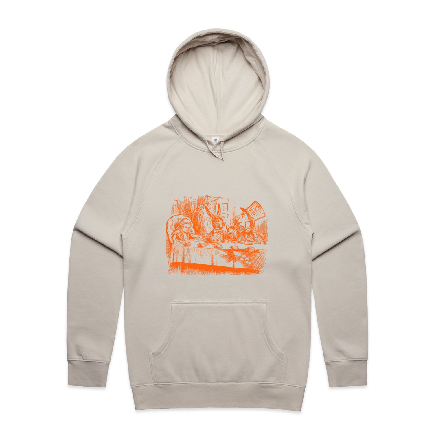 The Hoodies Alice in Wonderland - Mad Hatters Tea Party – Men's Hooded Sweatshirt is a high-quality men's hooded sweatshirt, printed with orange ink on the trusted AS Colour Supply Hood 5101. With a regular fit and mid-weight feel, it's crafted from a premium blend of 80% cotton and 20% polyester anti-pill fleece, making it a durable and comfortable staple for any wardrobe. The pullover design features raglan sleeves, a lined hood with tonal drawcord, ribbed sleeve cuffs, and a roomy kangaroo pocket — all designed to keep you warm while looking effortlessly sharp.