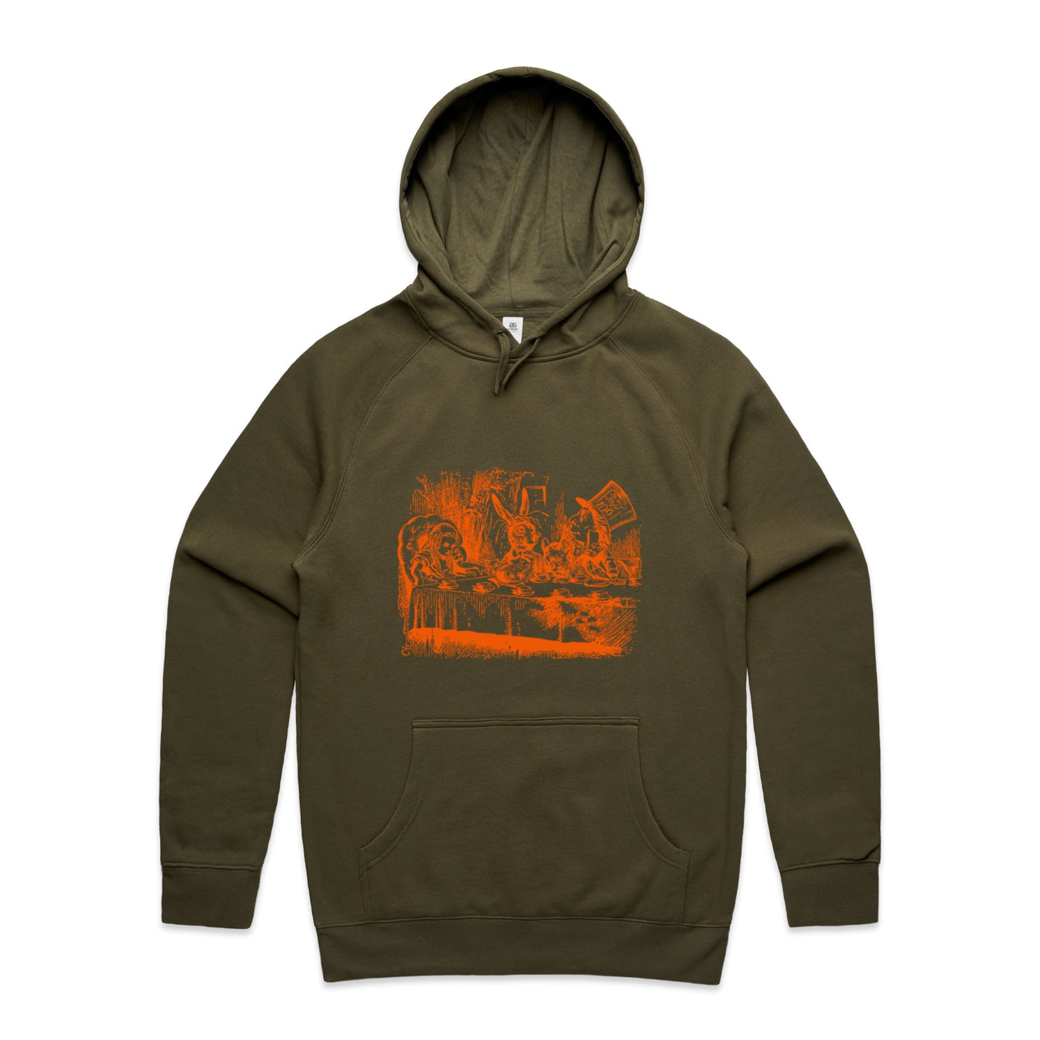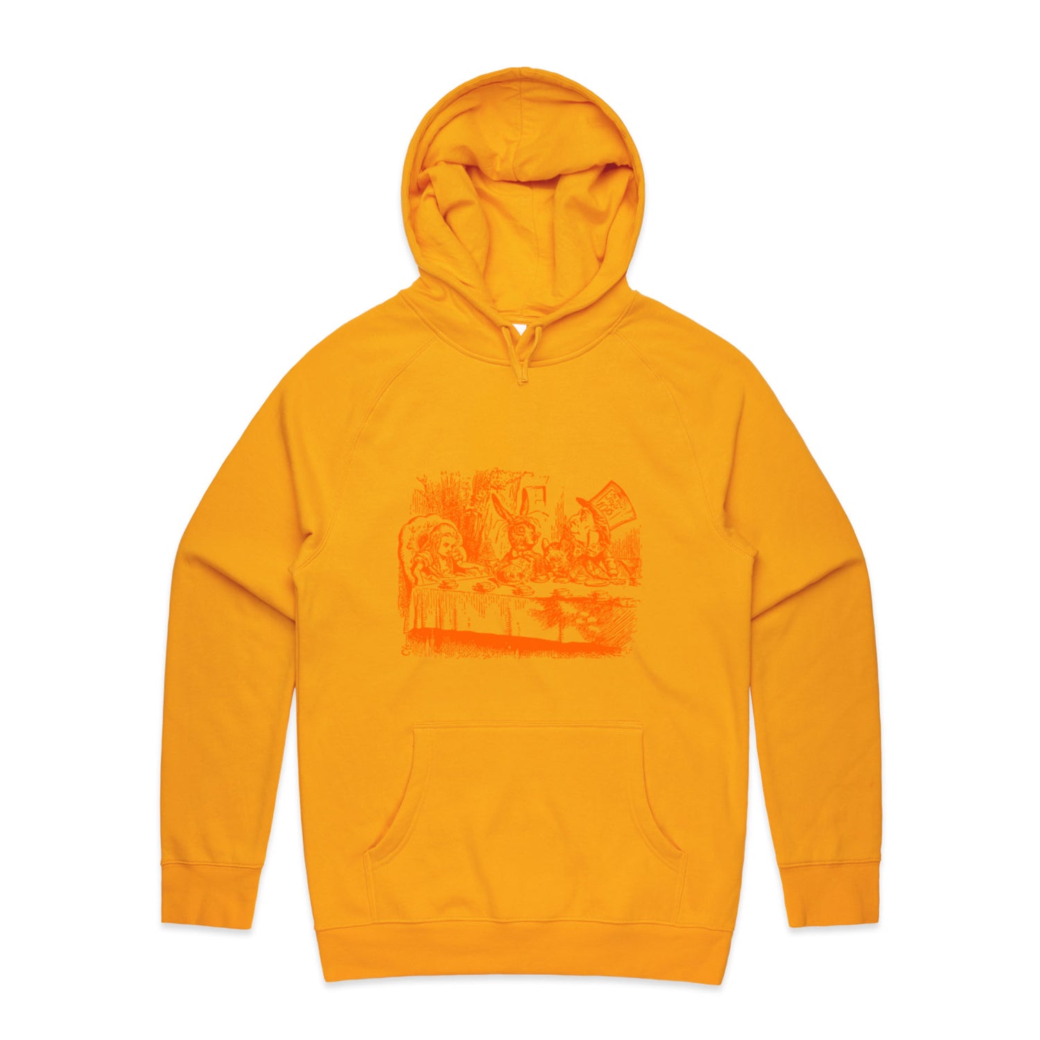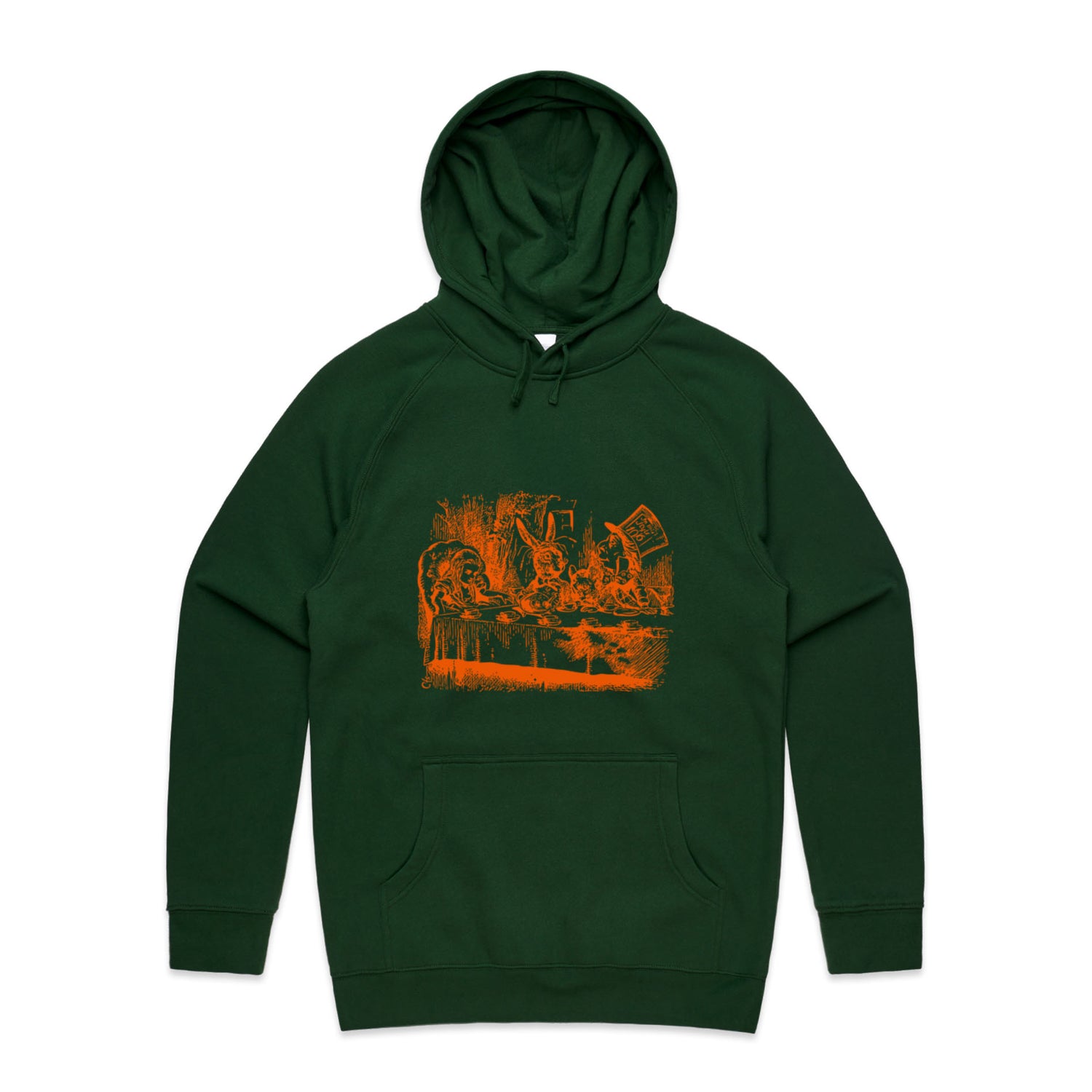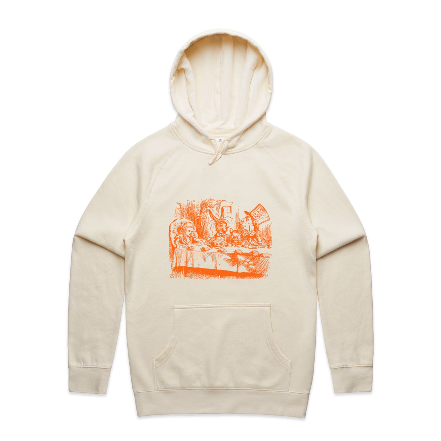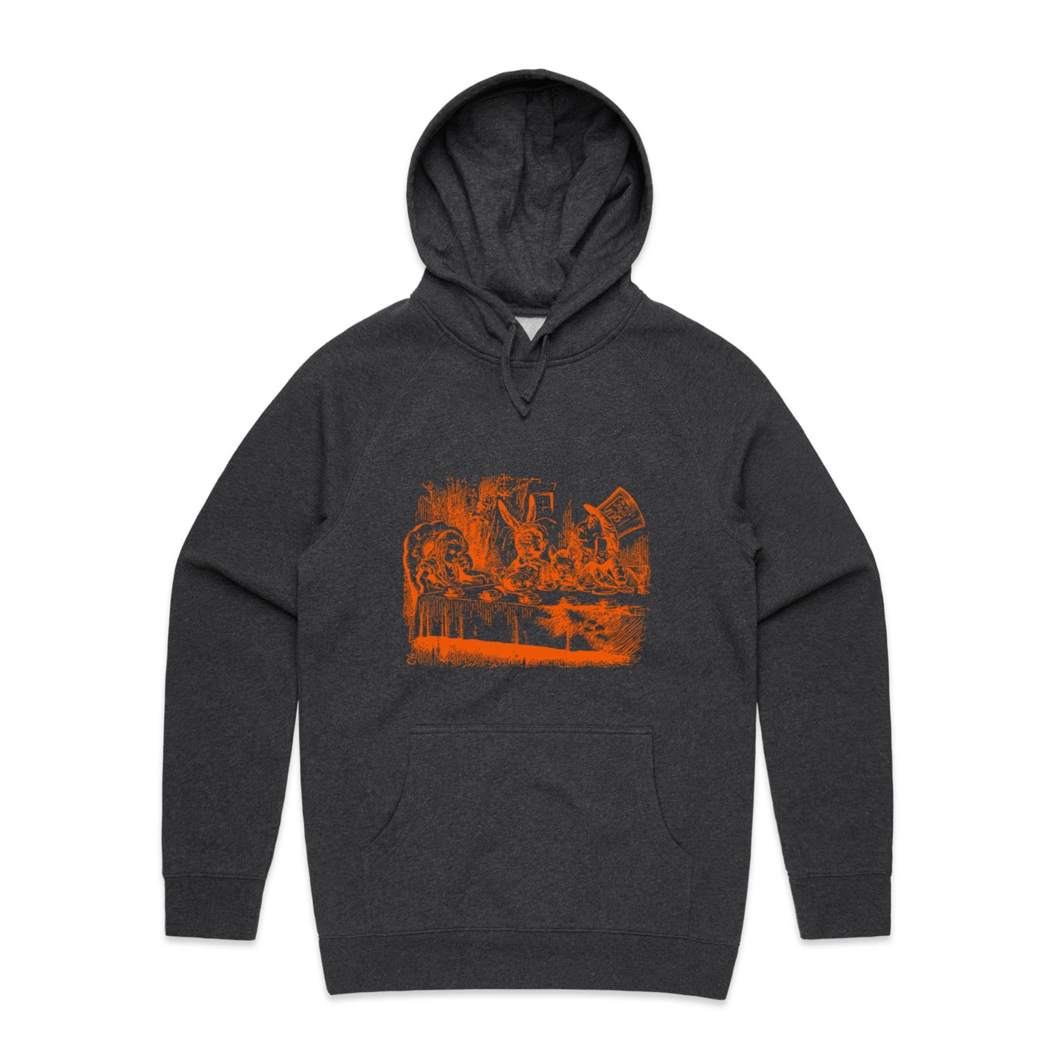 The Hoodies Alice in Wonderland - Mad Hatters Tea Party – Men's Hooded Sweatshirt is a high-quality men's hooded sweatshirt, printed with orange ink on the trusted AS Colour Supply Hood 5101. With a regular fit and mid-weight feel, it's crafted from a premium blend of 80% cotton and 20% polyester anti-pill fleece, making it a durable and comfortable staple for any wardrobe. The pullover design features raglan sleeves, a lined hood with tonal drawcord, ribbed sleeve cuffs, and a roomy kangaroo pocket — all designed to keep you warm while looking effortlessly sharp.