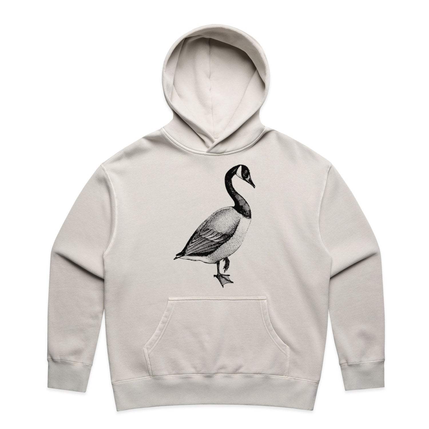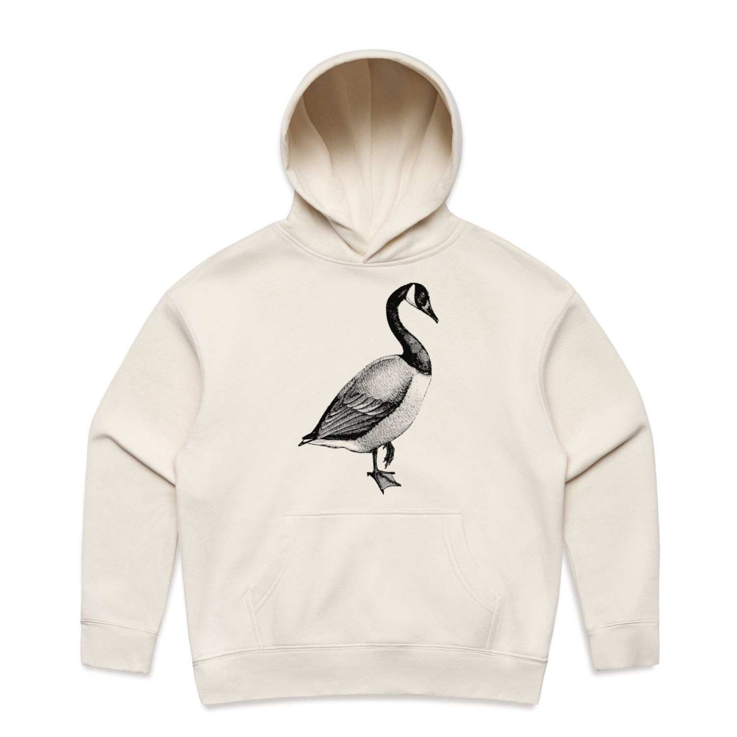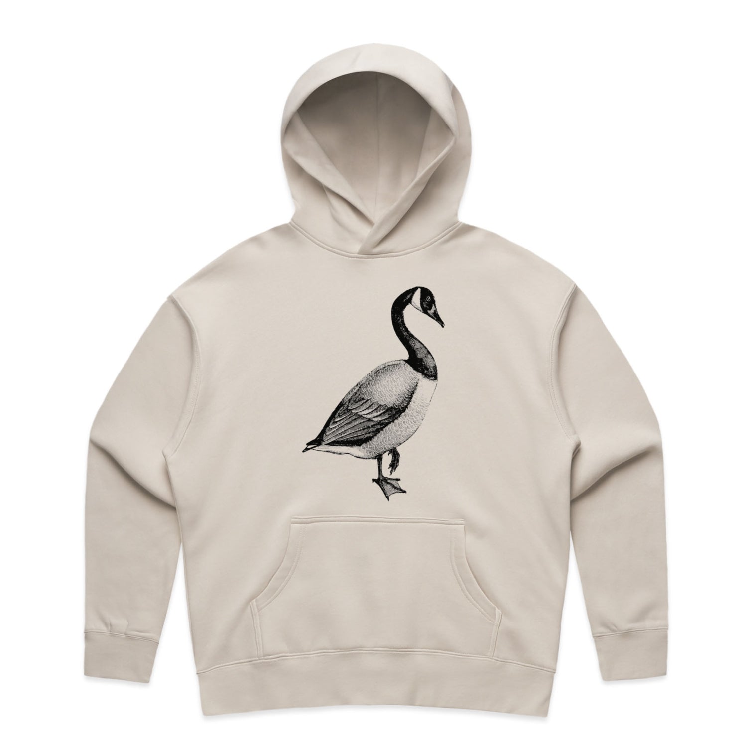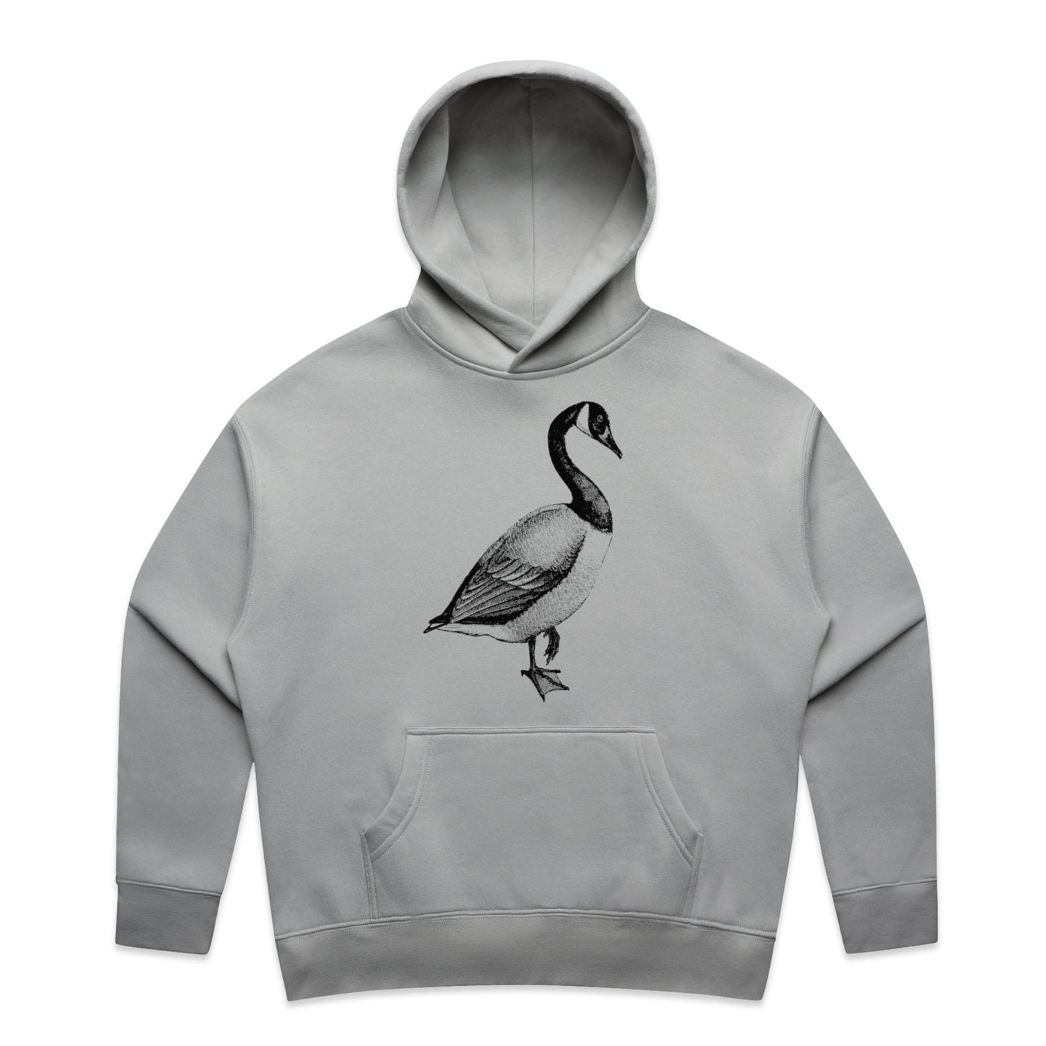 With its relaxed fit, you can snuggle up and let loose. It’s got a no-fuss pullover hood, drop shoulders that scream laid-back vibes, and a kangaroo pocket for all your snack-stashing needs. The little duck print comes splashed in bold black ink, so you can swagger with serious style.