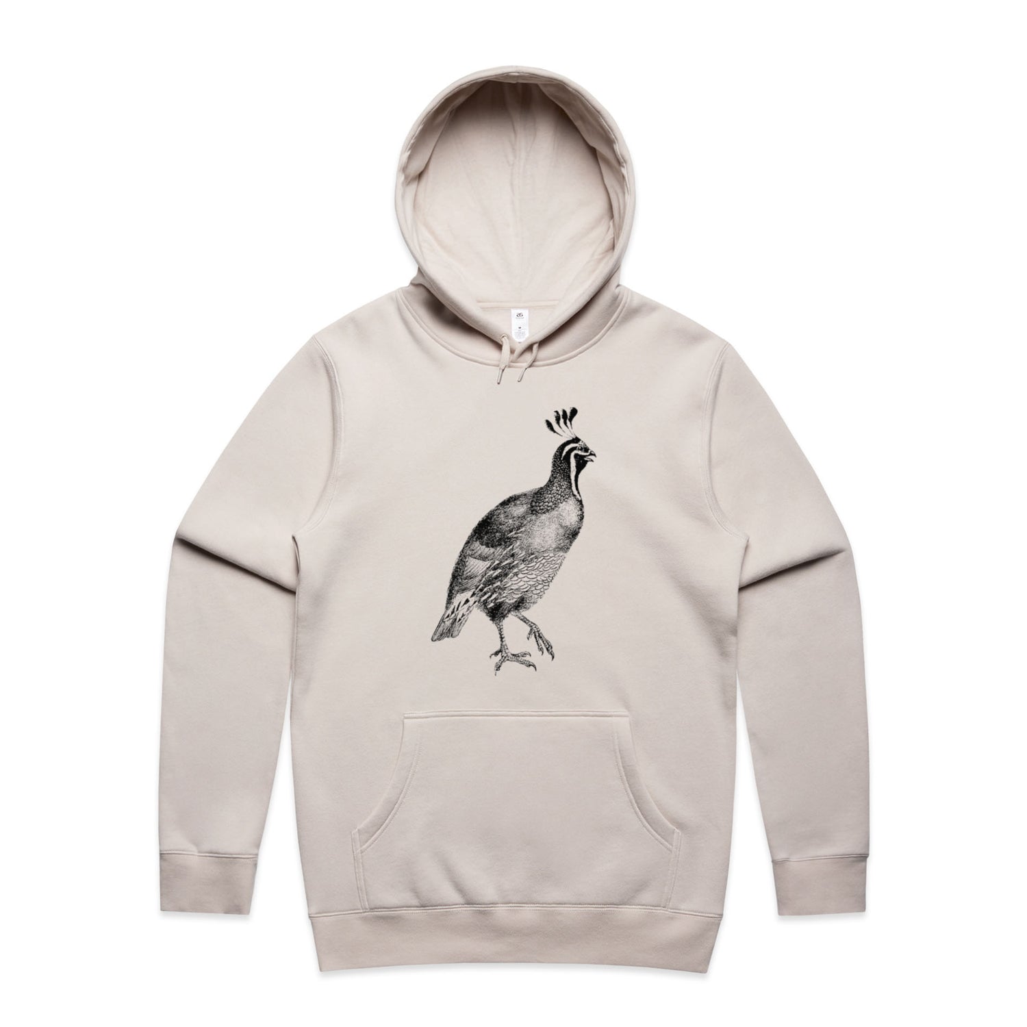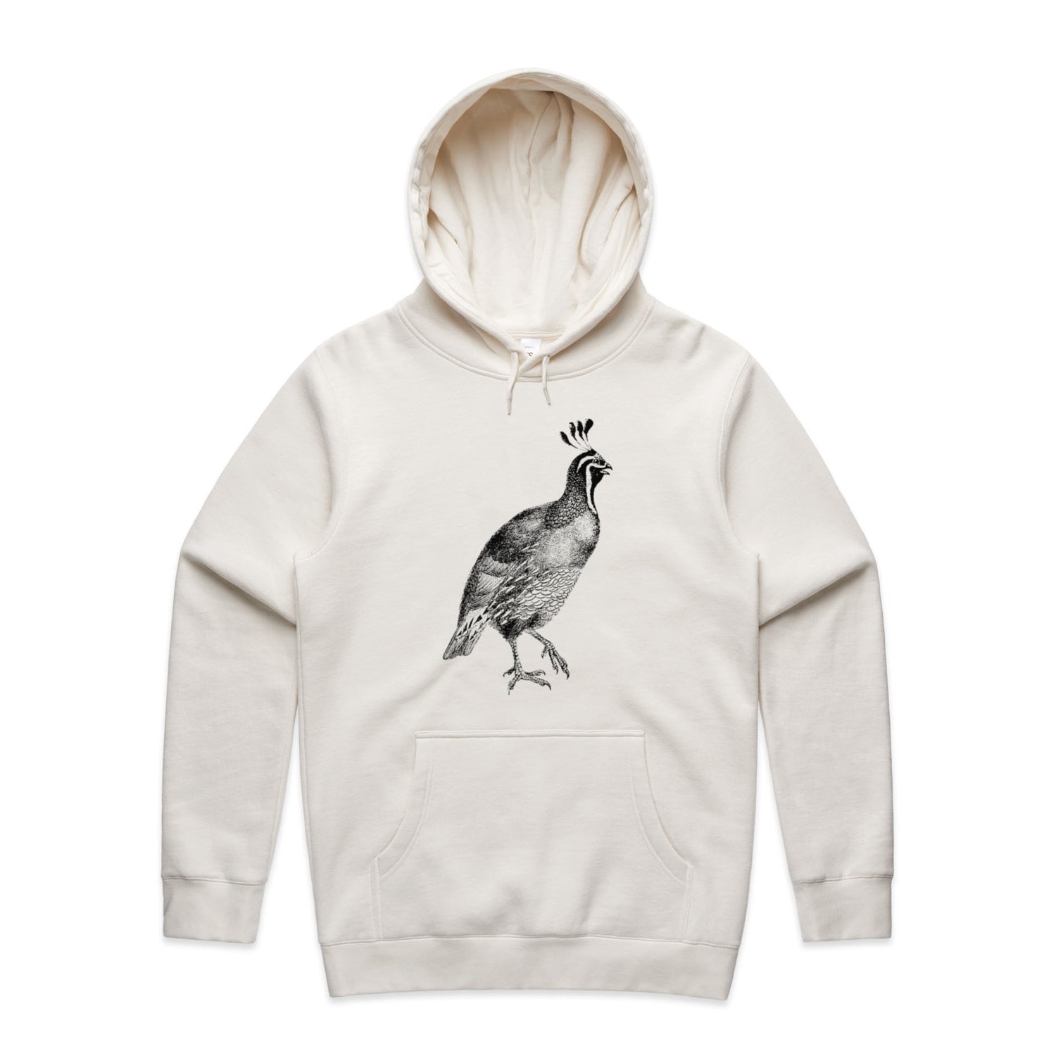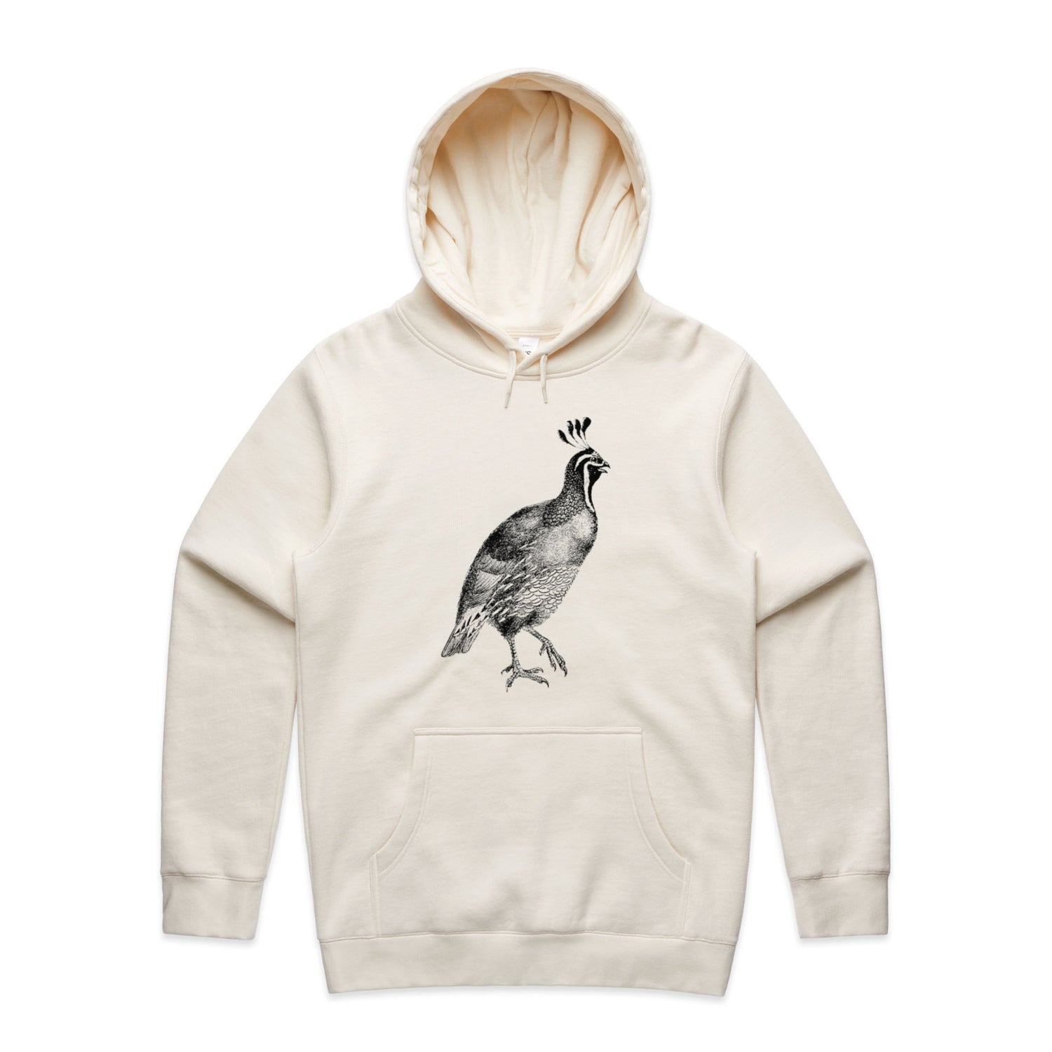 But what really takes flight here is the bold black quail print, adding a cheeky touch to your wardrobe. It's like having a slice of the wild on your chest, reminding you to strut your stuff with confidence. This hoodie is the ultimate mix of chill and thrill, perfect for adding a pop of personality to your day-to-day threads. Get around it!