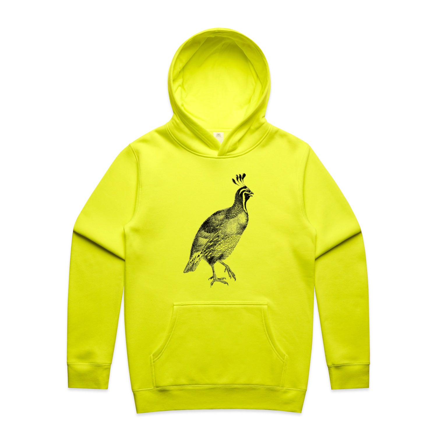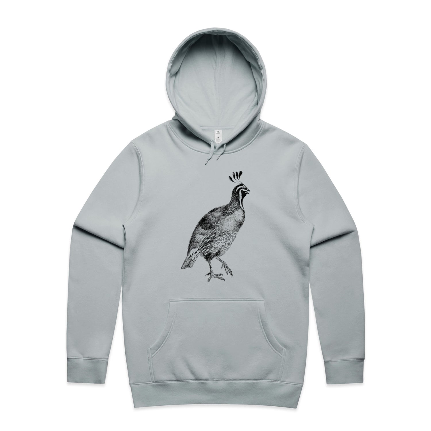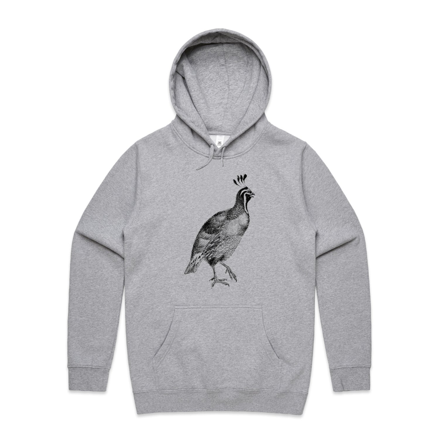 But what really takes flight here is the bold black quail print, adding a cheeky touch to your wardrobe. It's like having a slice of the wild on your chest, reminding you to strut your stuff with confidence. This hoodie is the ultimate mix of chill and thrill, perfect for adding a pop of personality to your day-to-day threads. Get around it!