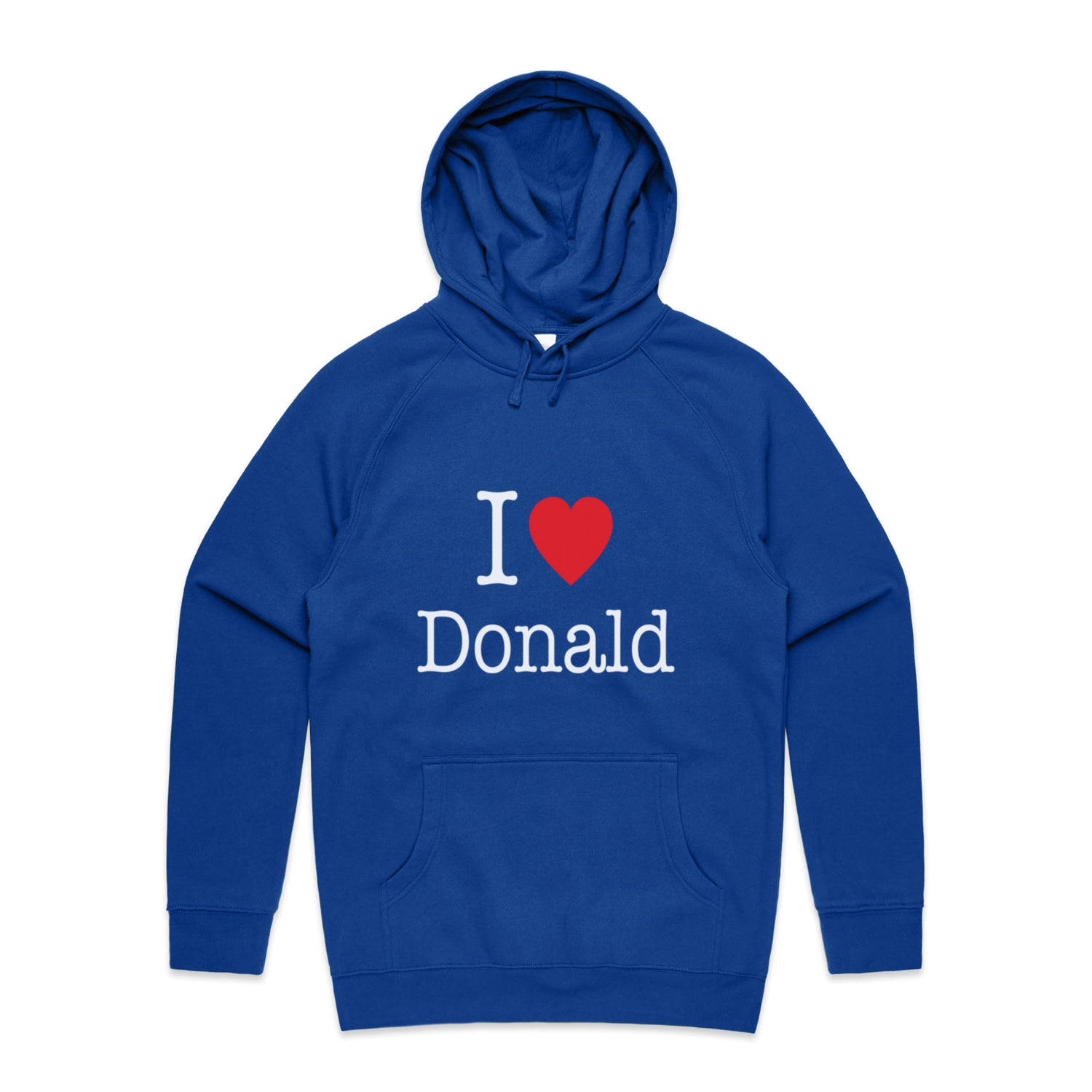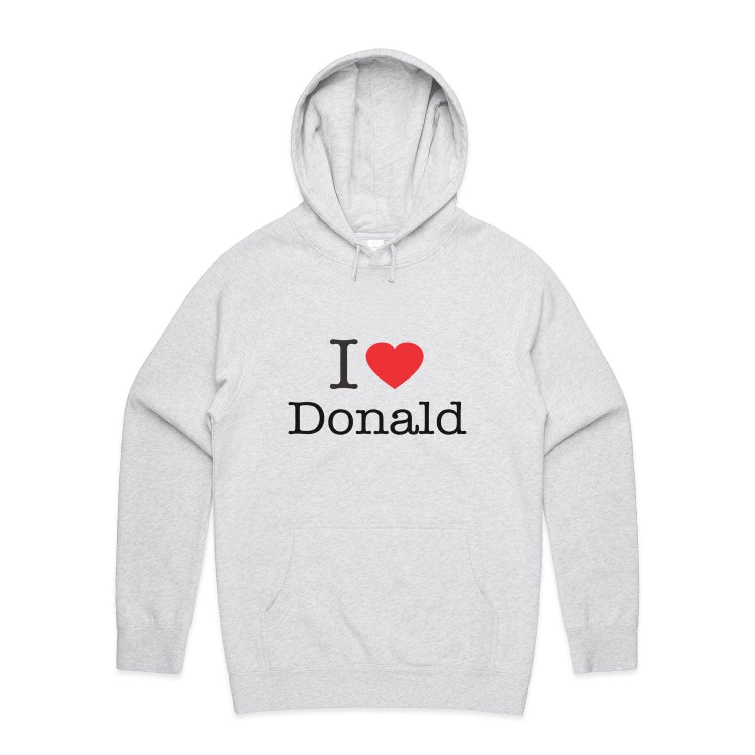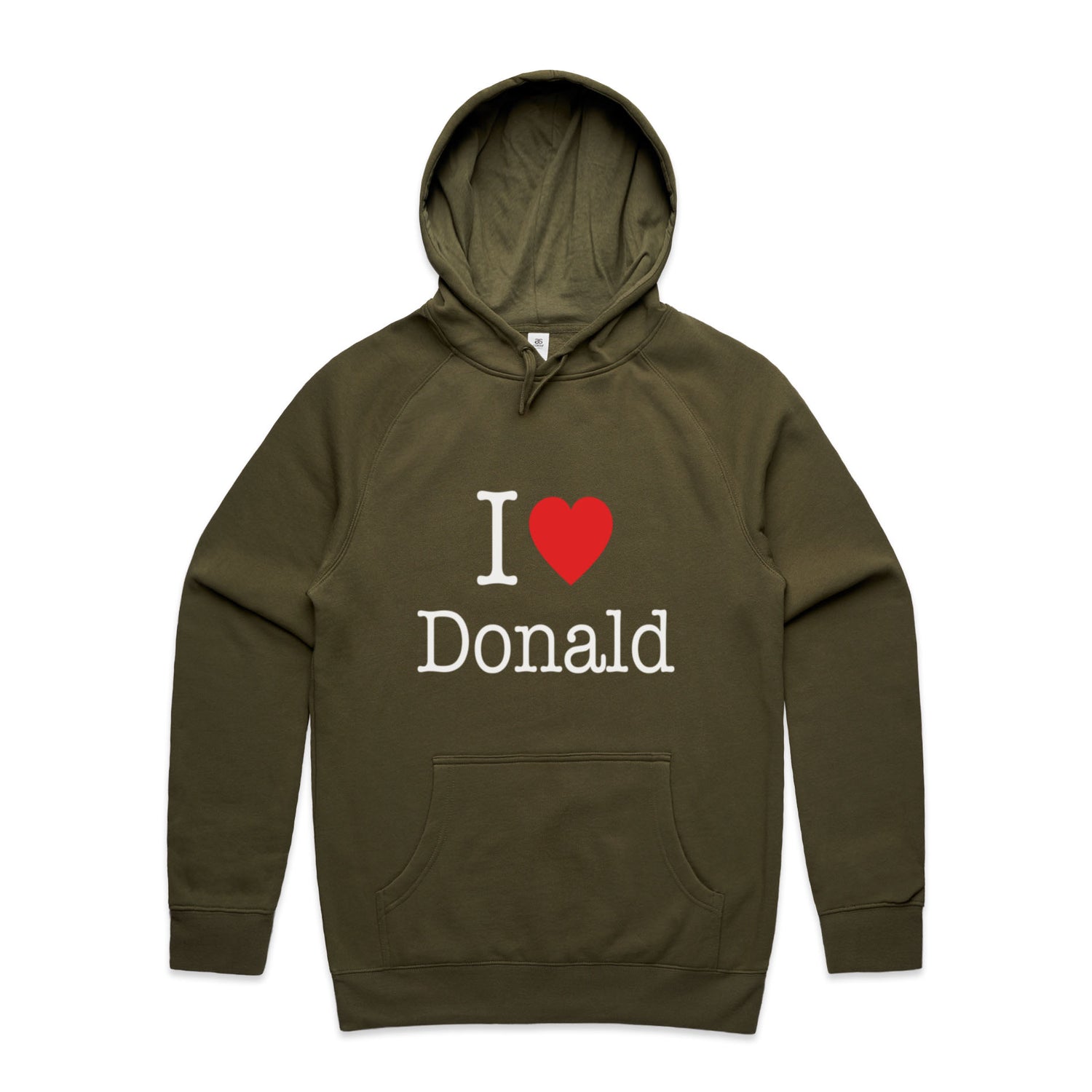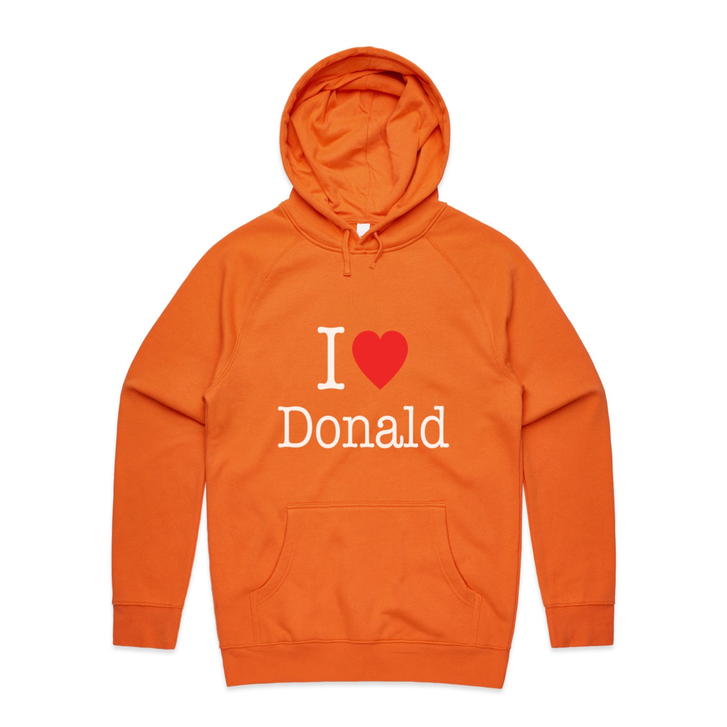 The Hoodies I Love Donald – Men's Hooded Sweatshirt is a high-quality men's hooded sweatshirt, printed with black ink on the trusted AS Colour Supply Hood 5101. With a regular fit and mid-weight feel, it's crafted from a premium blend of 80% cotton and 20% polyester anti-pill fleece, making it a durable and comfortable staple for any wardrobe. The pullover design features raglan sleeves, a lined hood with tonal drawcord, ribbed sleeve cuffs, and a roomy kangaroo pocket — all designed to keep you warm while looking effortlessly sharp.