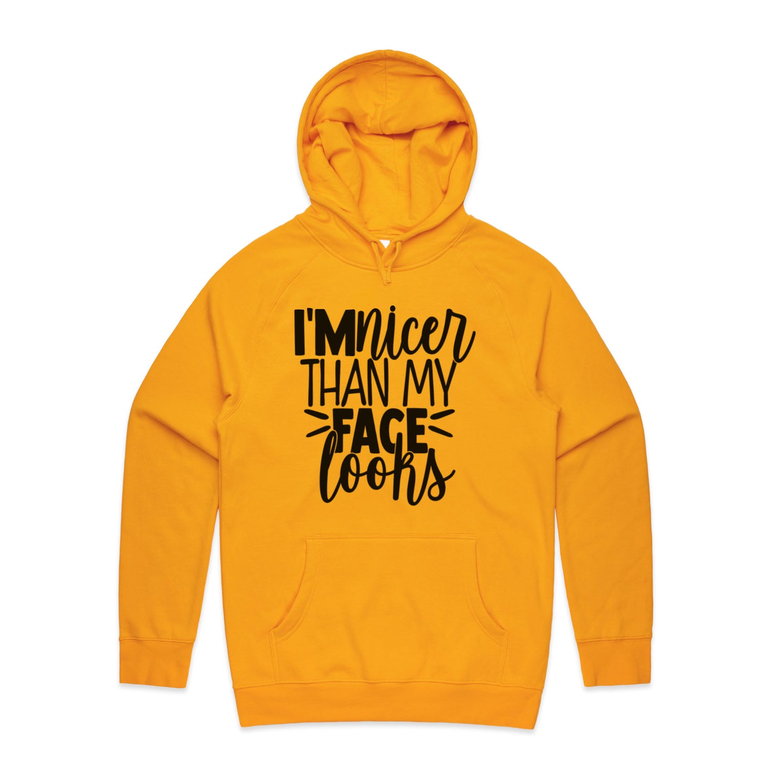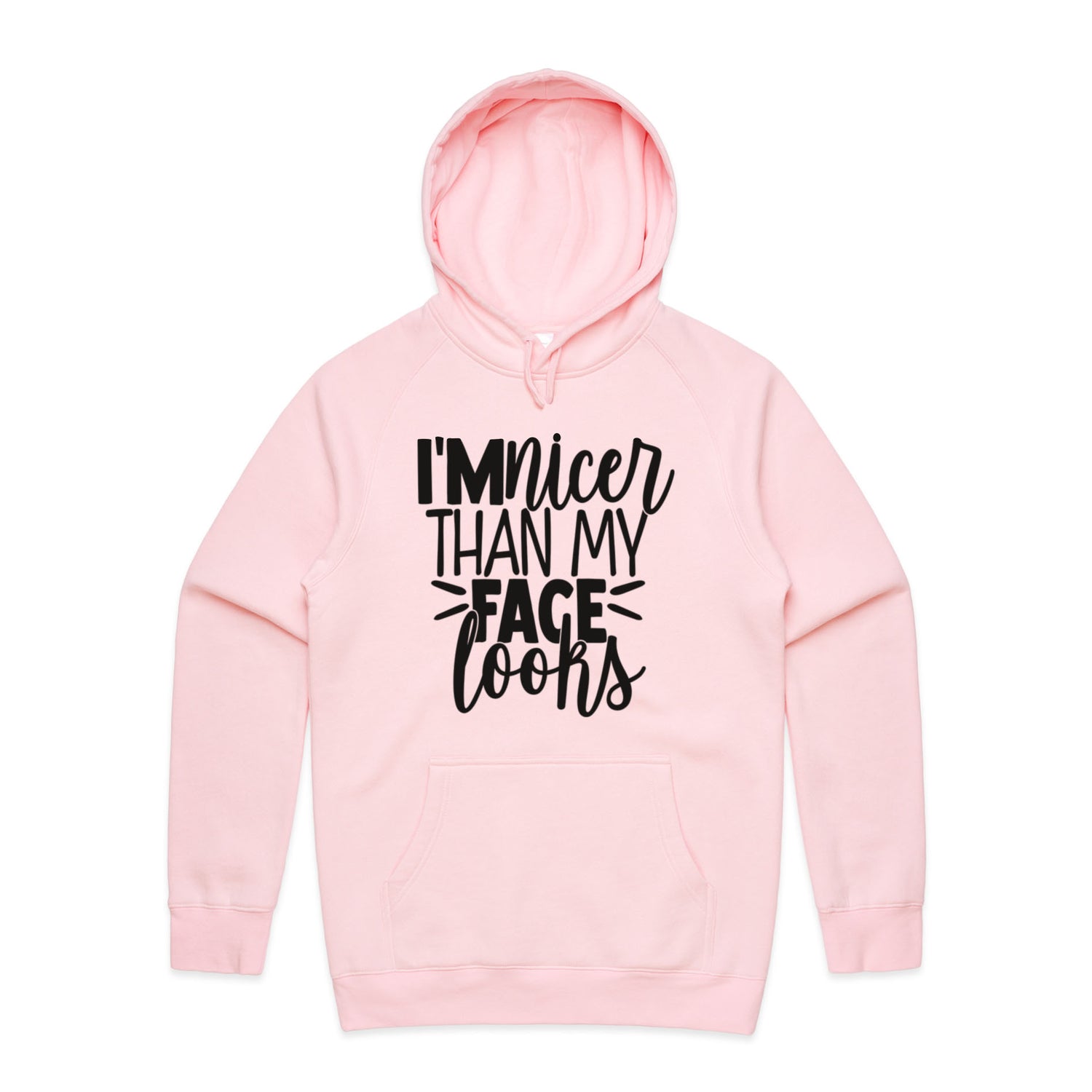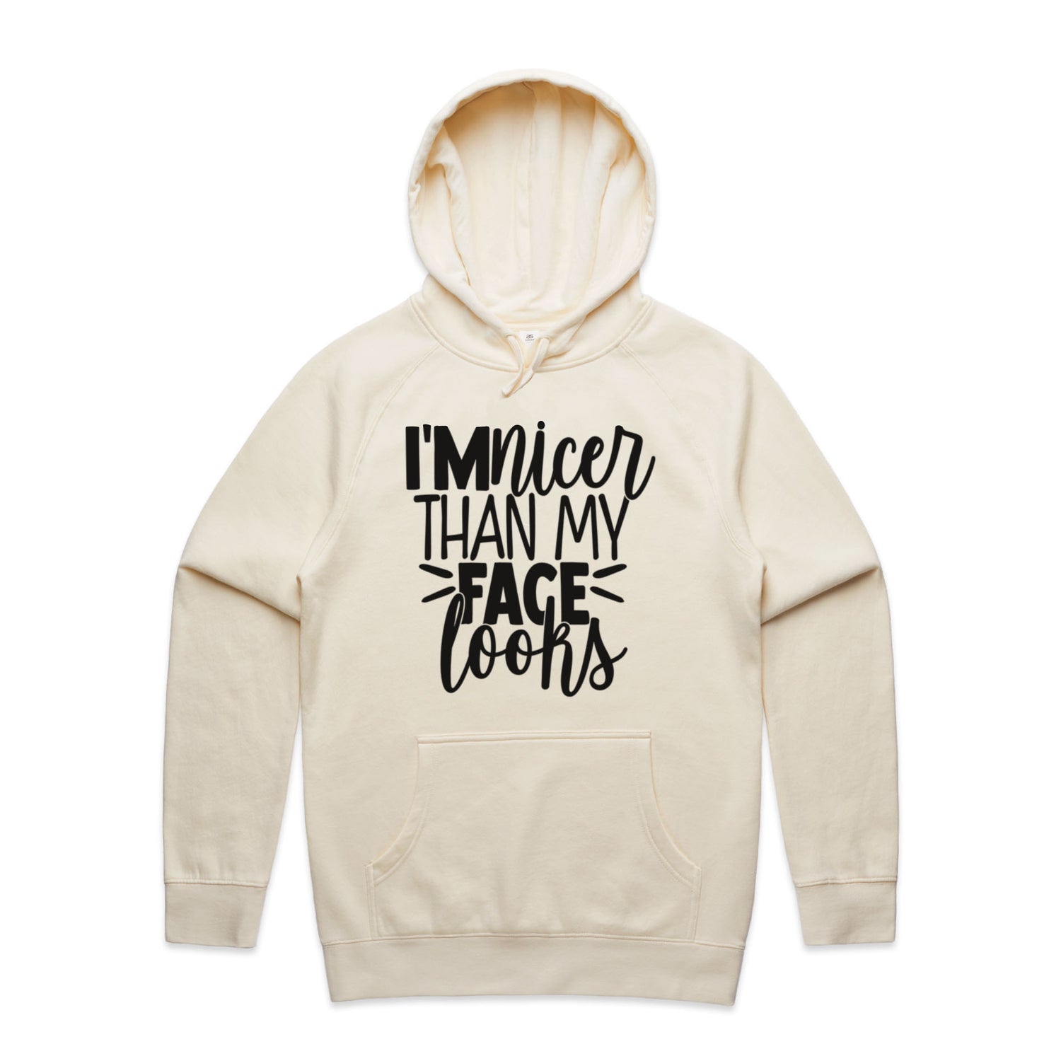 The Hoodies I'm Nicer Face Looks – Men's Hooded Sweatshirt is a high-quality men's hooded sweatshirt, printed with black ink on the trusted AS Colour Supply Hood 5101. With a regular fit and mid-weight feel, it's crafted from a premium blend of 80% cotton and 20% polyester anti-pill fleece, making it a durable and comfortable staple for any wardrobe. The pullover design features raglan sleeves, a lined hood with tonal drawcord, ribbed sleeve cuffs, and a roomy kangaroo pocket — all designed to keep you warm while looking effortlessly sharp.