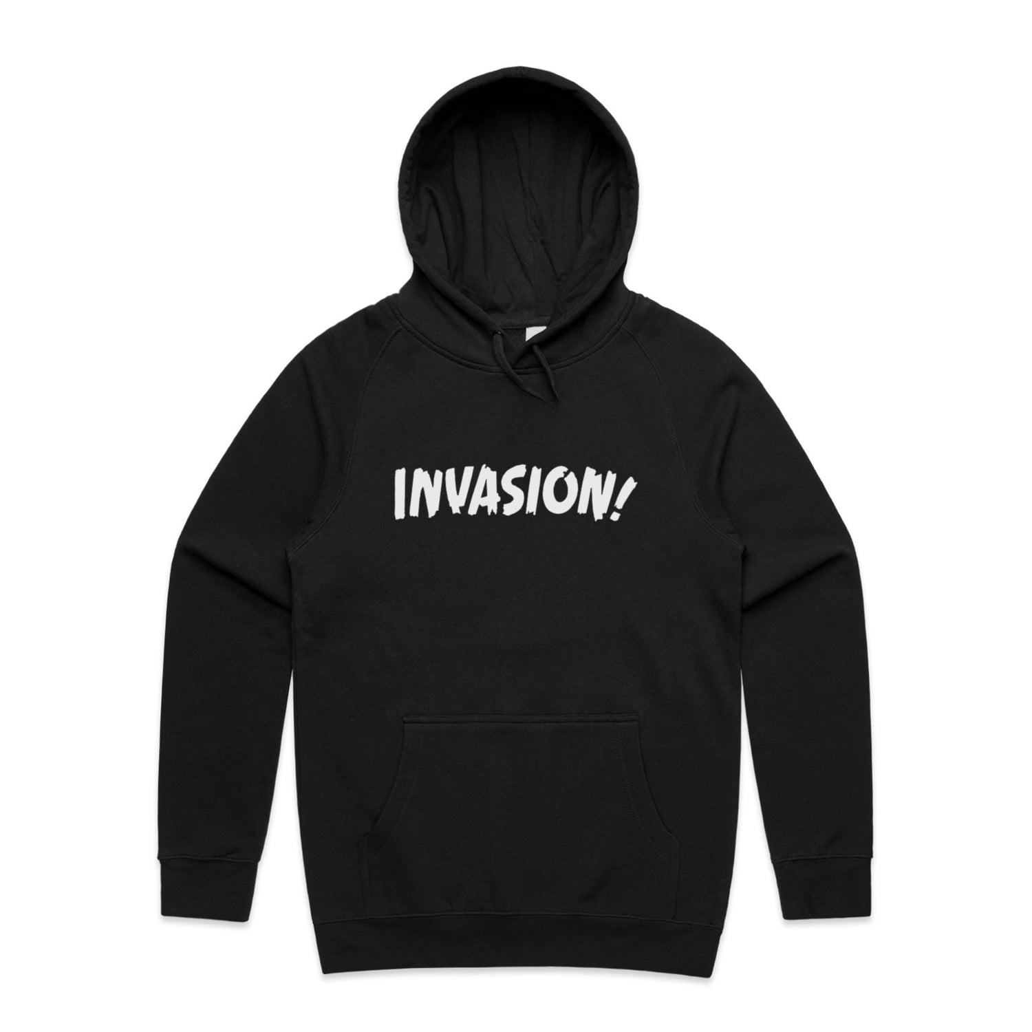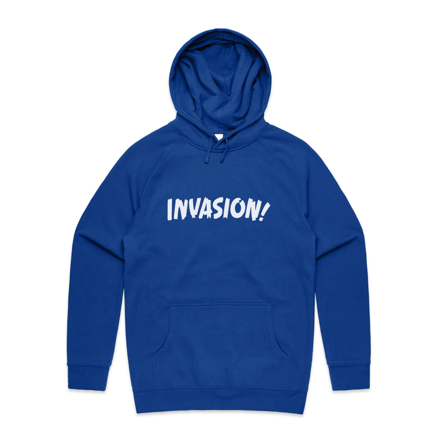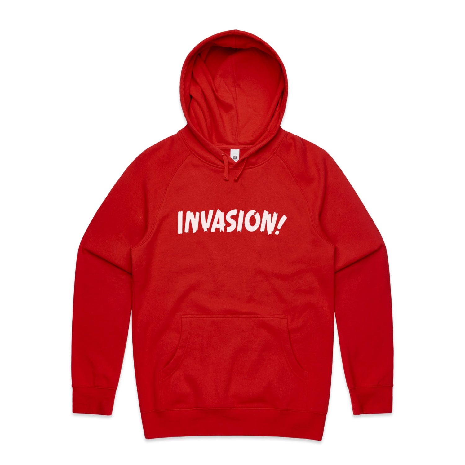 The Hoodies Invasion! – Men's Hooded Sweatshirt is a high-quality men's hooded sweatshirt, printed with white ink on the trusted AS Colour Supply Hood 5101. With a regular fit and mid-weight feel, it's crafted from a premium blend of 80% cotton and 20% polyester anti-pill fleece, making it a durable and comfortable staple for any wardrobe. The pullover design features raglan sleeves, a lined hood with tonal drawcord, ribbed sleeve cuffs, and a roomy kangaroo pocket — all designed to keep you warm while looking effortlessly sharp.