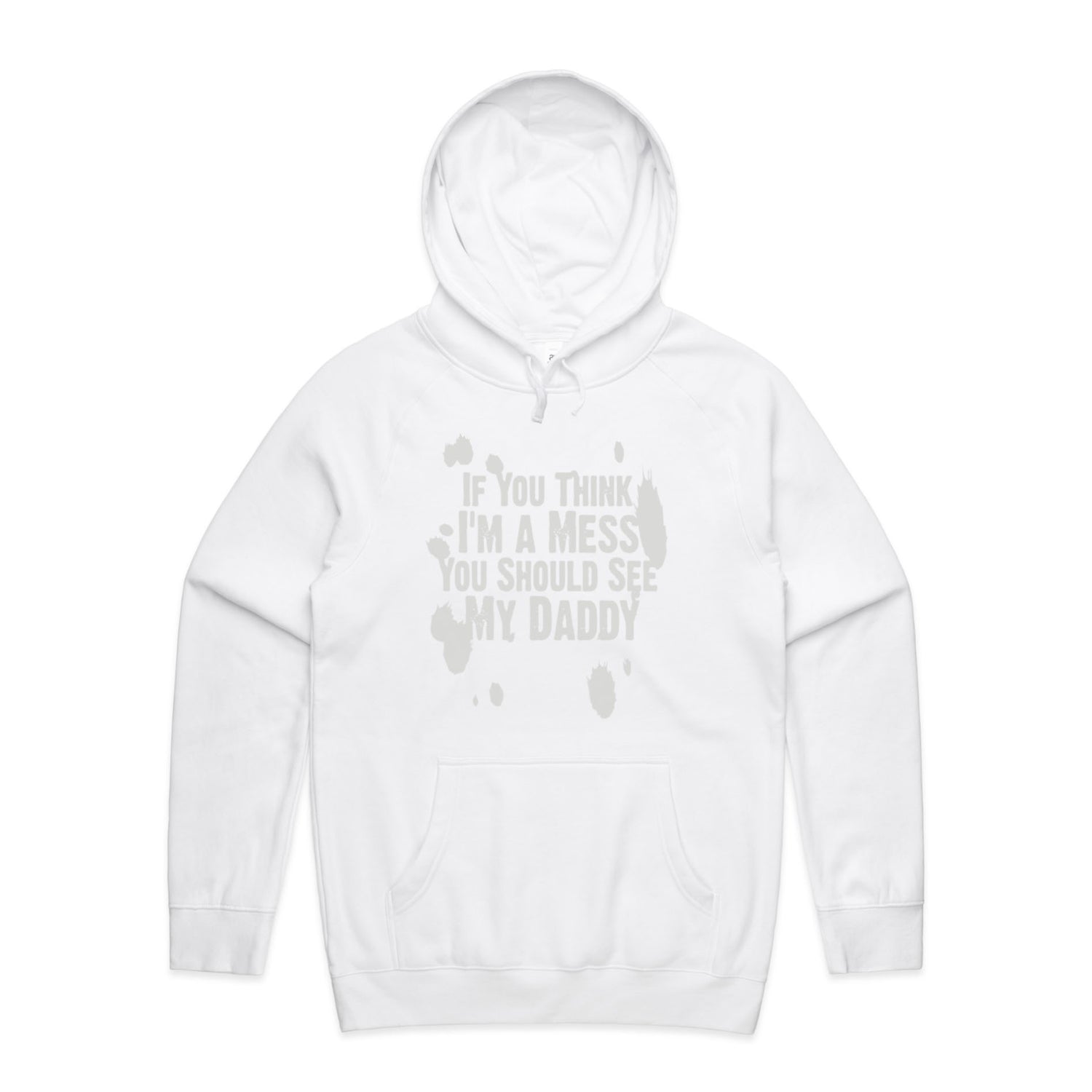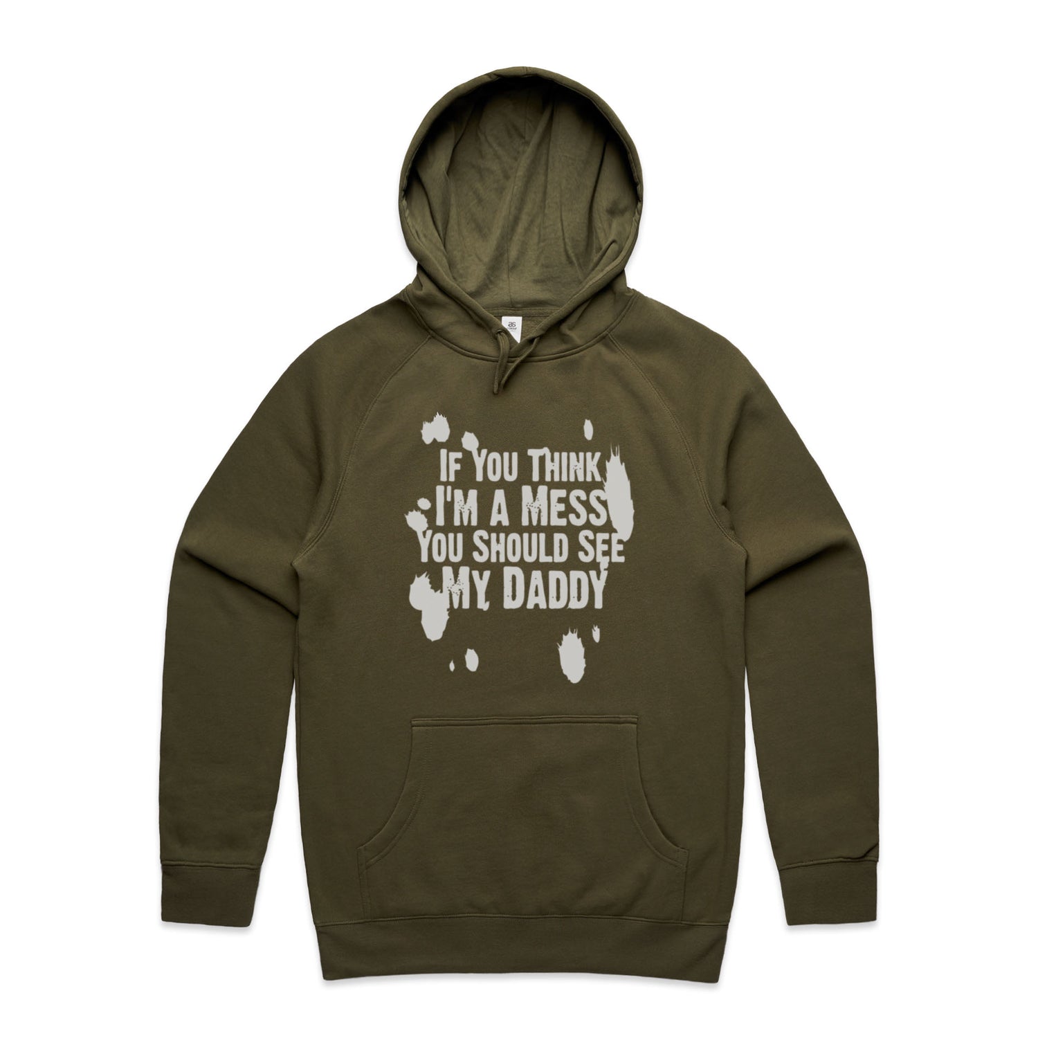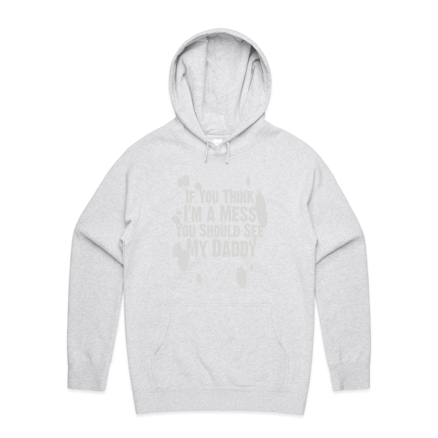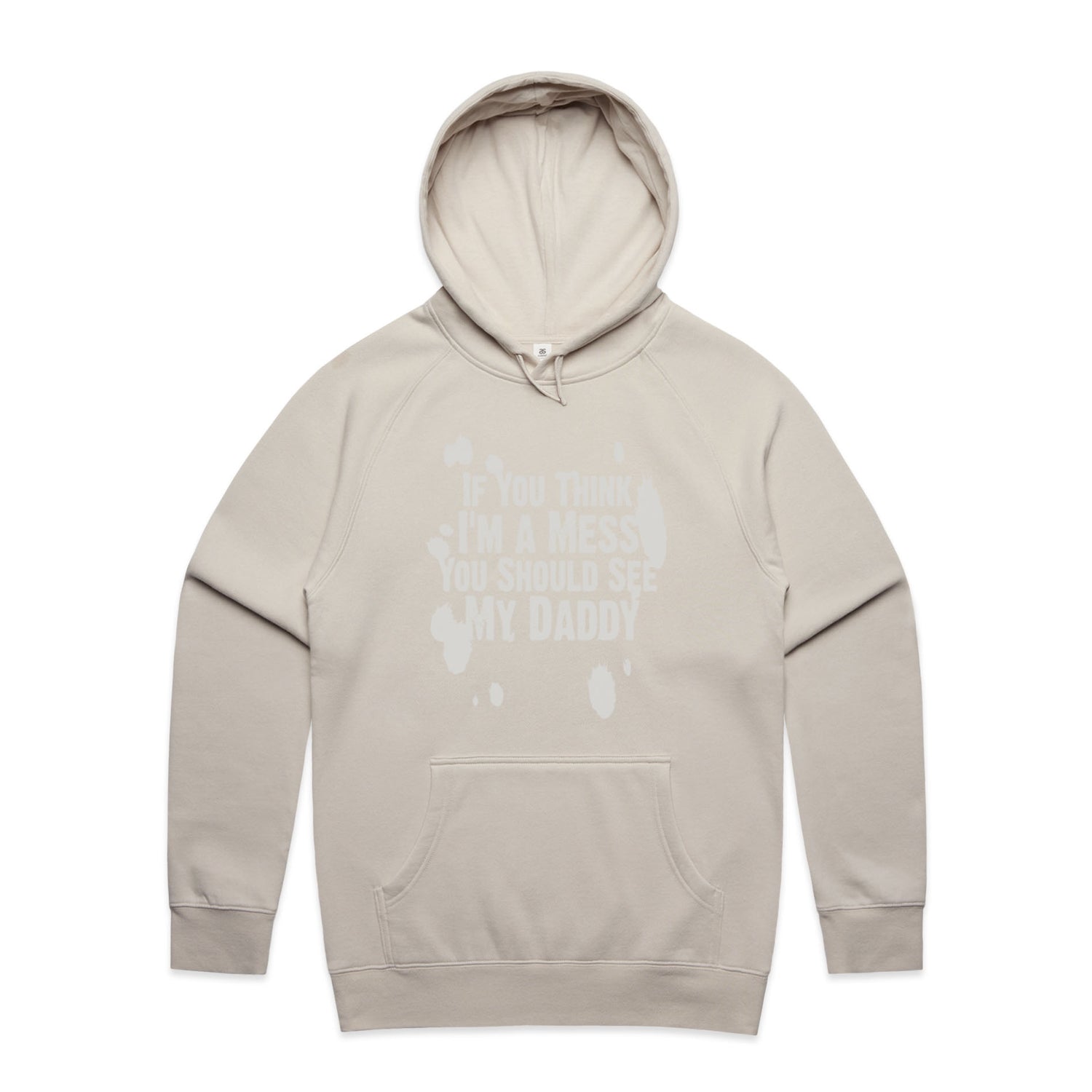 The Hoodies Kid, I'm a Mess – Men's Hooded Sweatshirt is a high-quality men's hooded sweatshirt, printed with light grey ink on the trusted AS Colour Supply Hood 5101. With a regular fit and mid-weight feel, it's crafted from a premium blend of 80% cotton and 20% polyester anti-pill fleece, making it a durable and comfortable staple for any wardrobe. The pullover design features raglan sleeves, a lined hood with tonal drawcord, ribbed sleeve cuffs, and a roomy kangaroo pocket — all designed to keep you warm while looking effortlessly sharp.