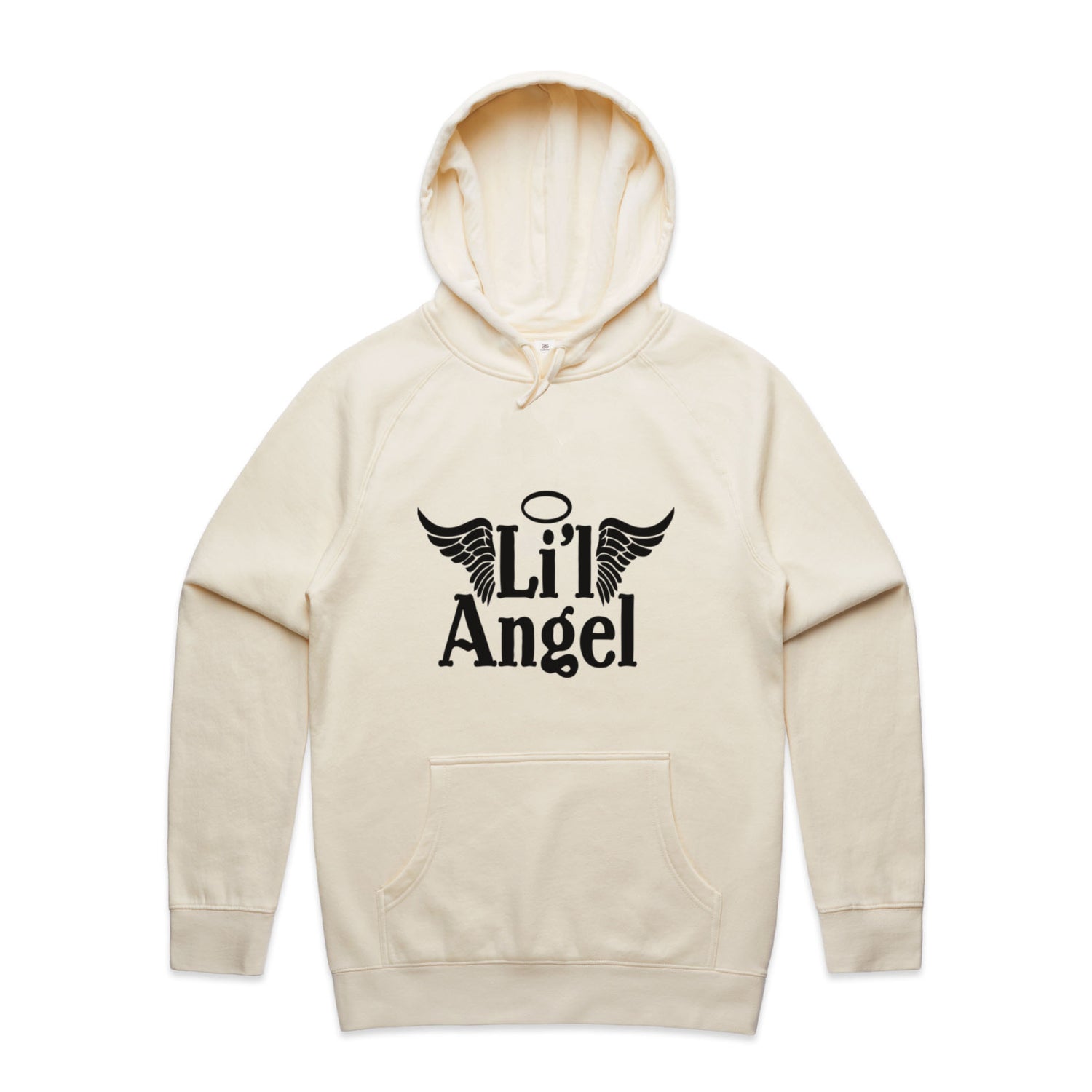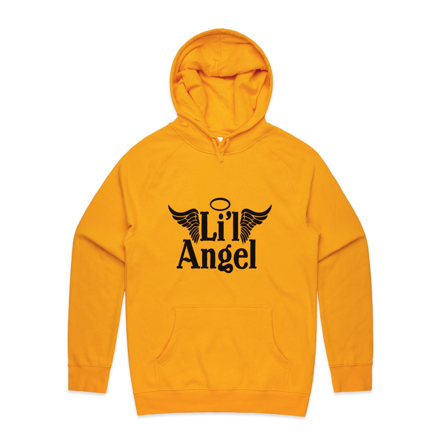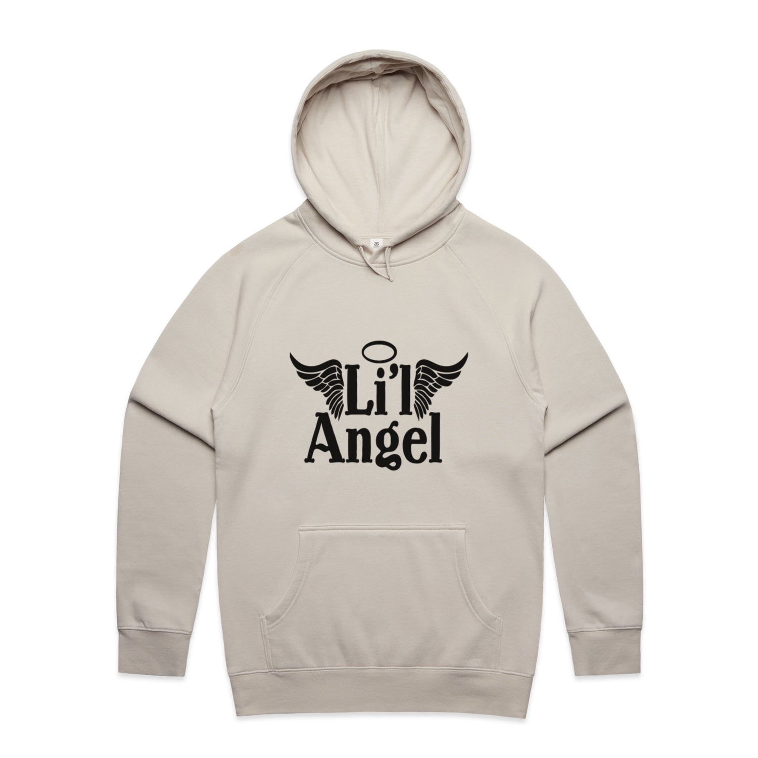 The Hoodies Kid Lil' Angel – Men's Hooded Sweatshirt is a high-quality men's hooded sweatshirt, printed with black ink on the trusted AS Colour Supply Hood 5101. With a regular fit and mid-weight feel, it's crafted from a premium blend of 80% cotton and 20% polyester anti-pill fleece, making it a durable and comfortable staple for any wardrobe. The pullover design features raglan sleeves, a lined hood with tonal drawcord, ribbed sleeve cuffs, and a roomy kangaroo pocket — all designed to keep you warm while looking effortlessly sharp.
