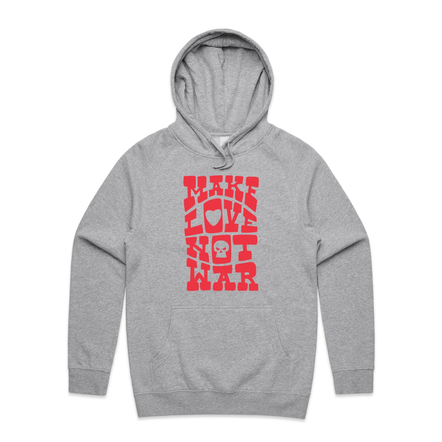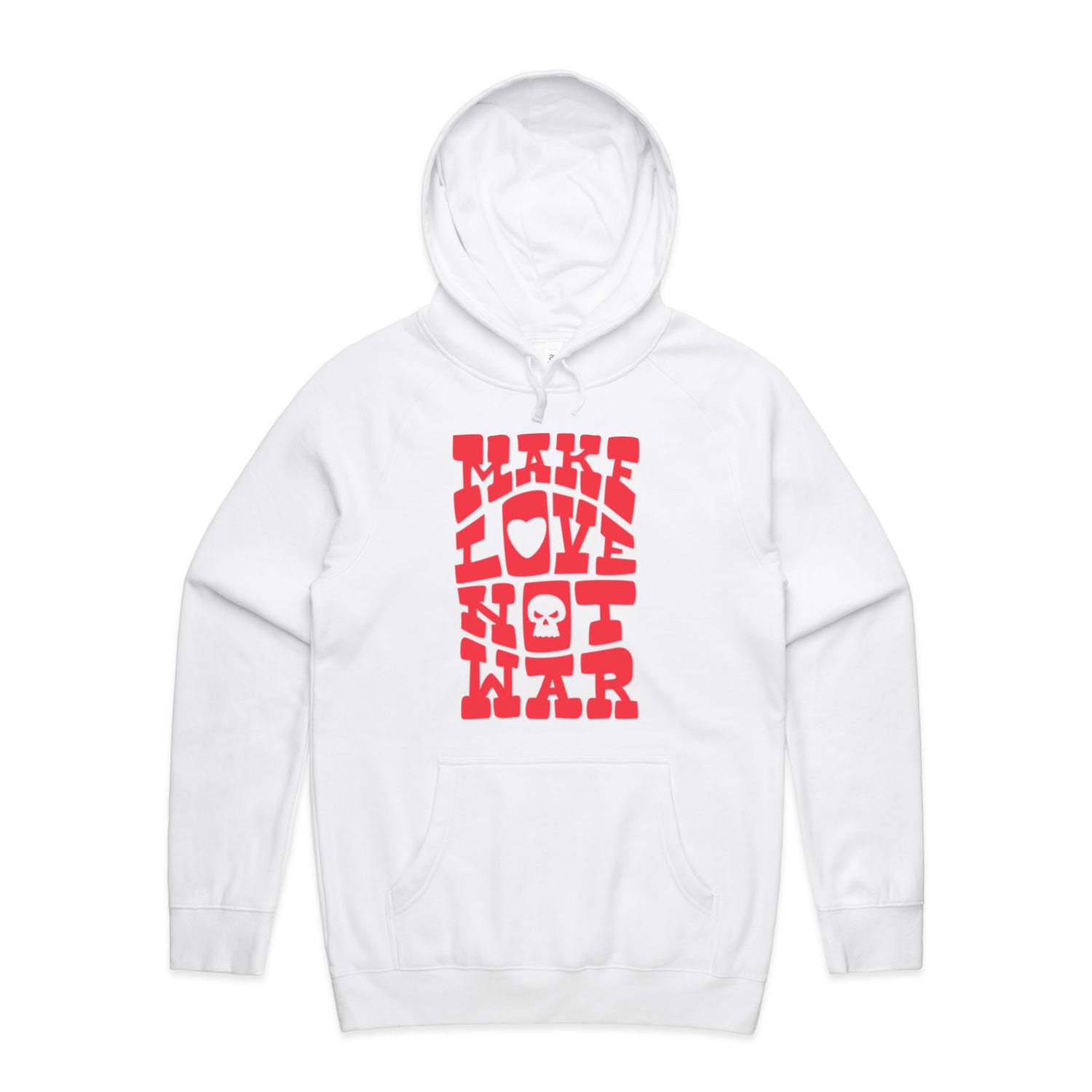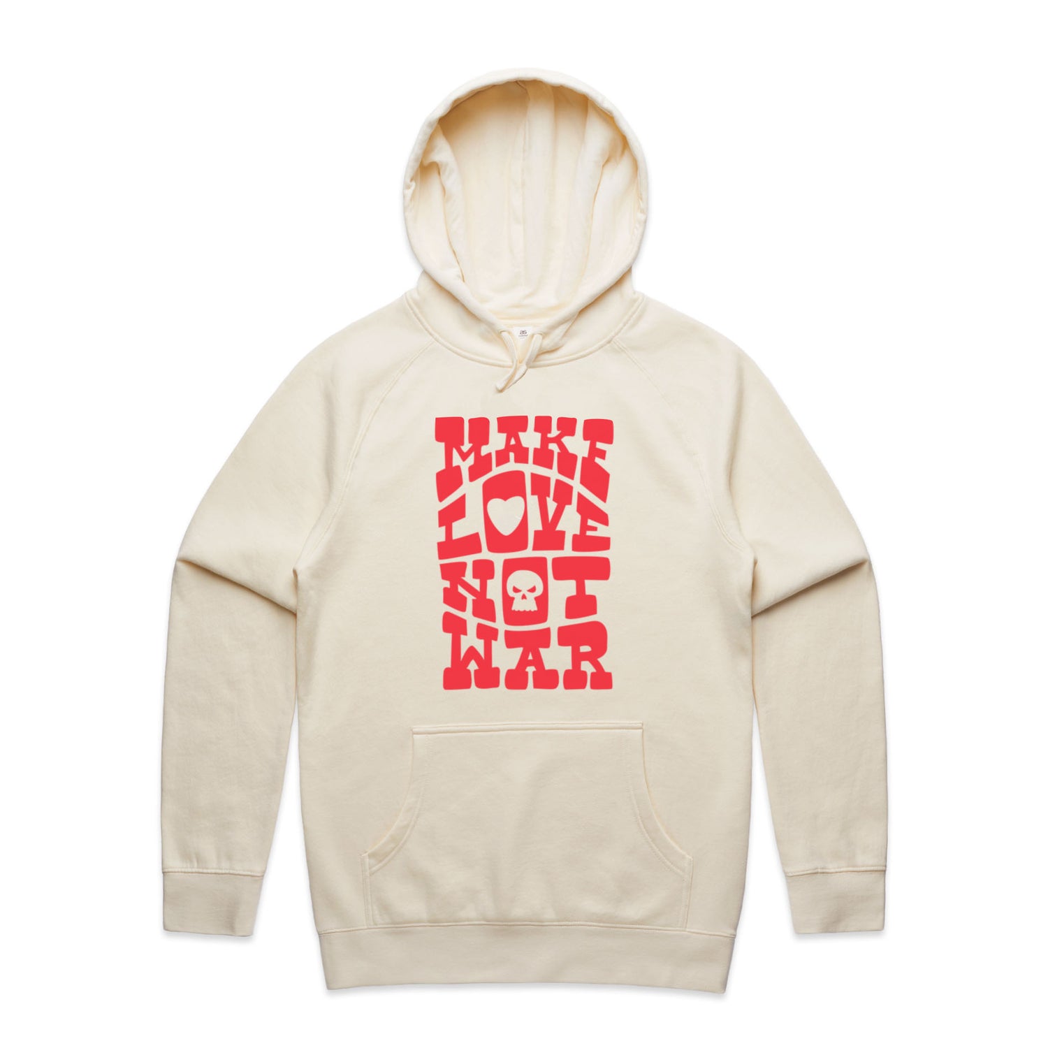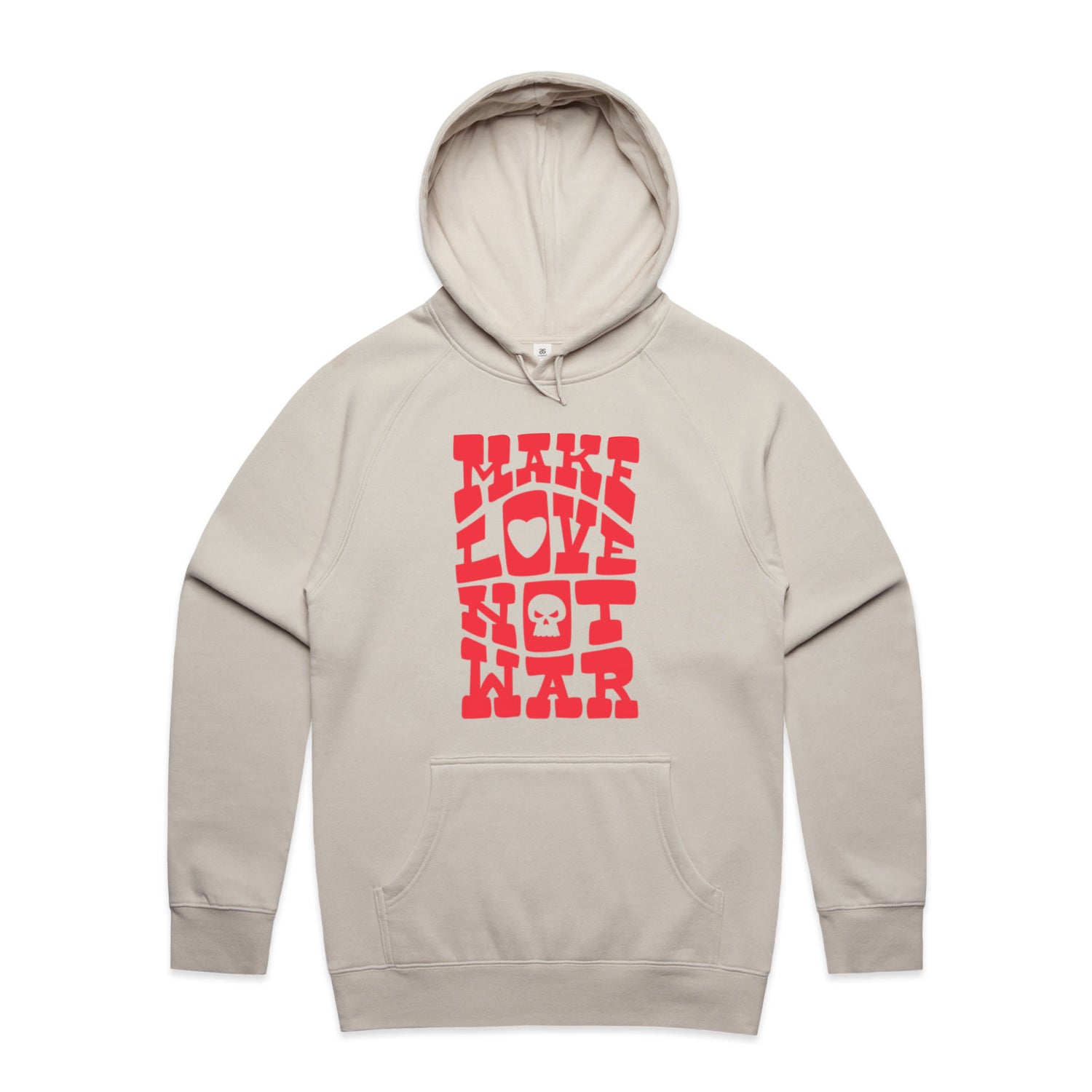 The Hoodies Make Love Not War – Men's Hooded Sweatshirt is a high-quality men's hooded sweatshirt, printed with red ink on the trusted AS Colour Supply Hood 5101. With a regular fit and mid-weight feel, it's crafted from a premium blend of 80% cotton and 20% polyester anti-pill fleece, making it a durable and comfortable staple for any wardrobe. The pullover design features raglan sleeves, a lined hood with tonal drawcord, ribbed sleeve cuffs, and a roomy kangaroo pocket — all designed to keep you warm while looking effortlessly sharp.