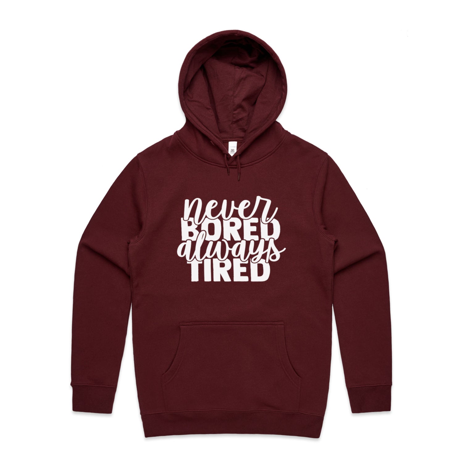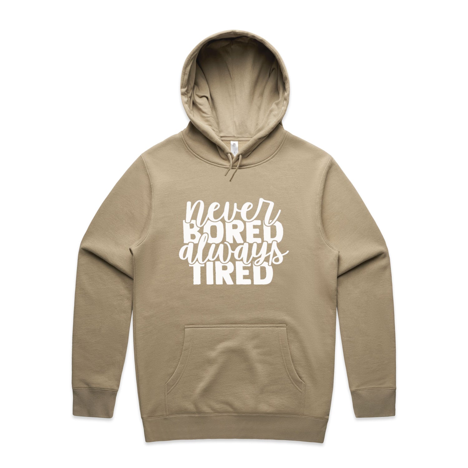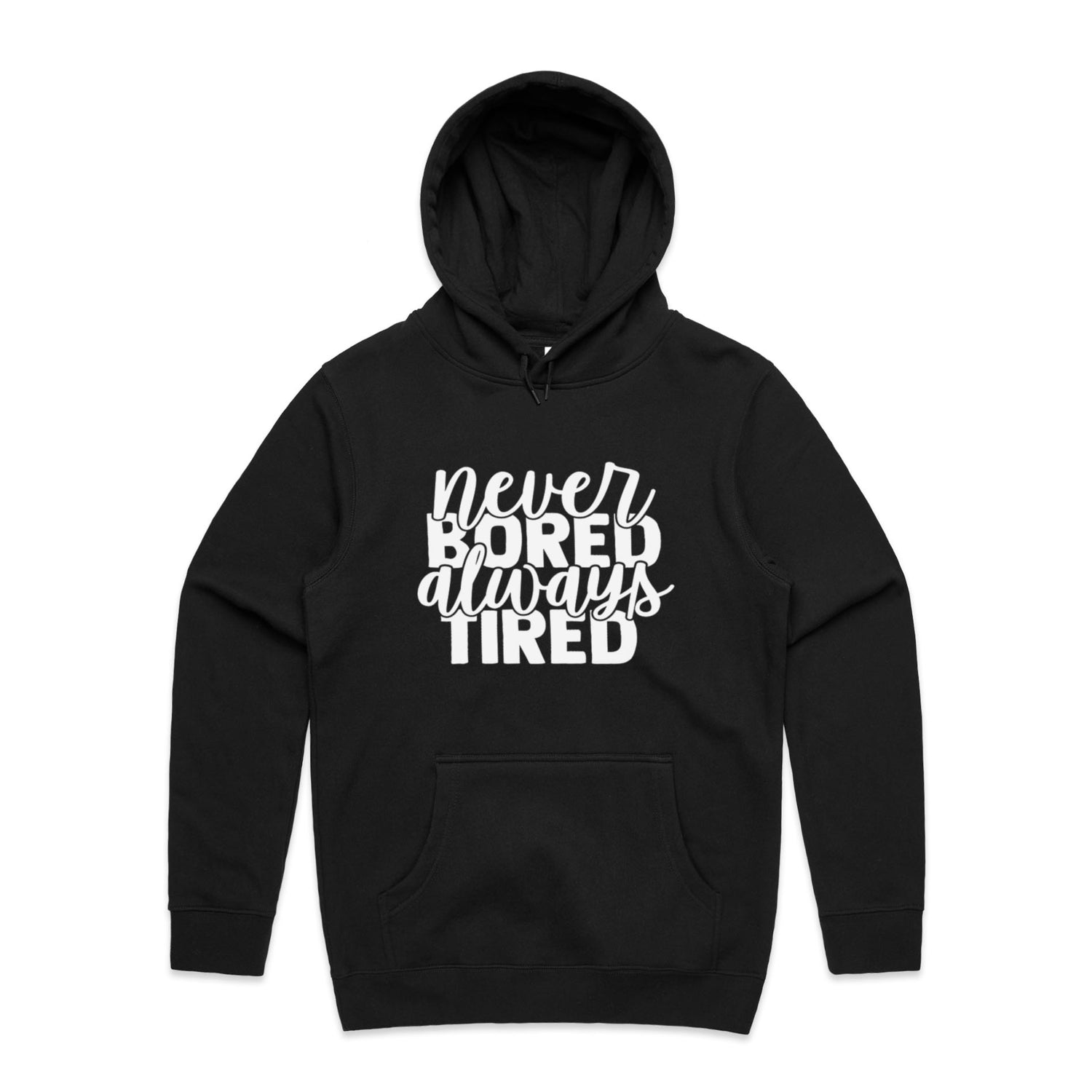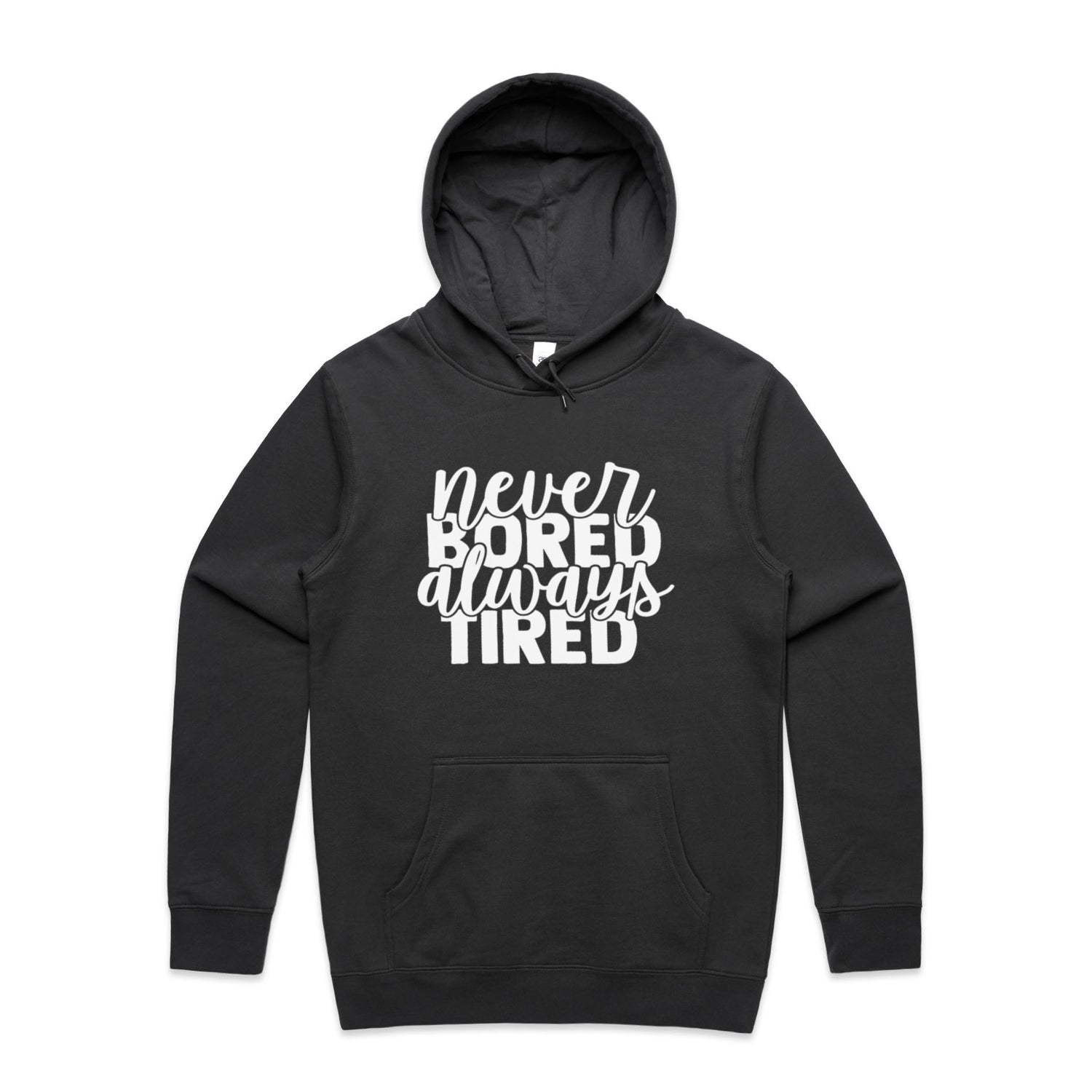 Unlock the secret combo of comfort and cheek with our Never Bored Tired Unisex Hooded Sweatshirt! Perfect for the legend who loves a good laugh, this hoodie’s got your back—literally—with a snappy quote that'll keep the vibes high and the yawns low. Lovingly slapped onto AS Colour's Stencil series, this bad boy's got a comfy regular fit, a handy kangaroo pocket for all your bits-n-bobs, and a lined hood for when you're hitting the snooze button on style.