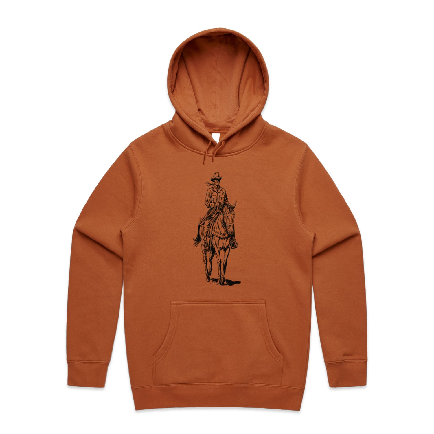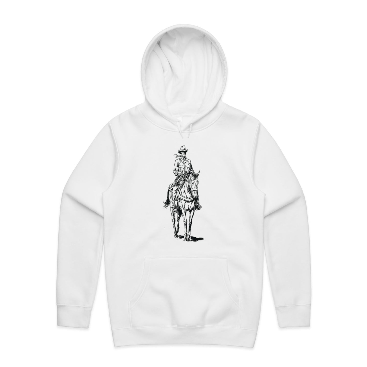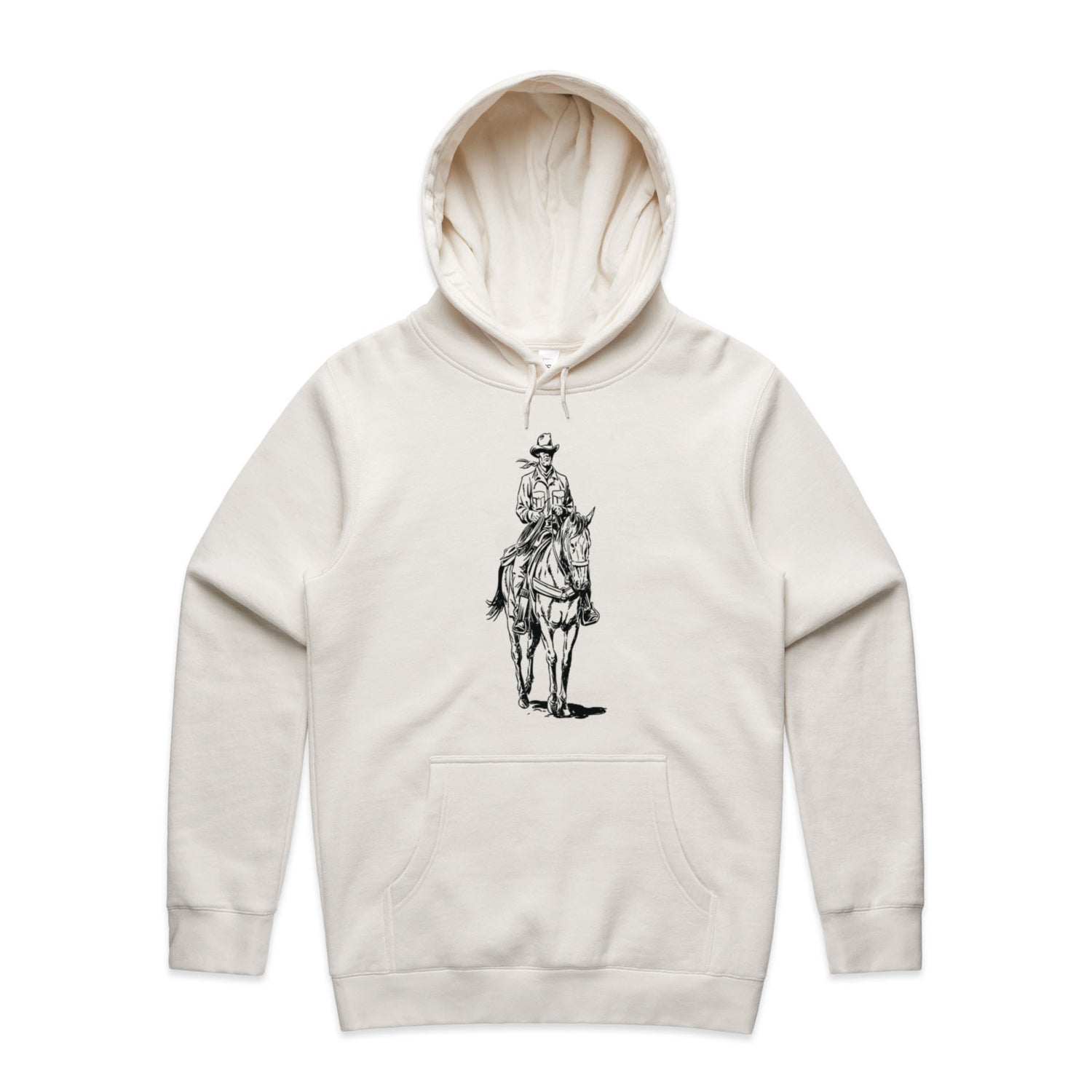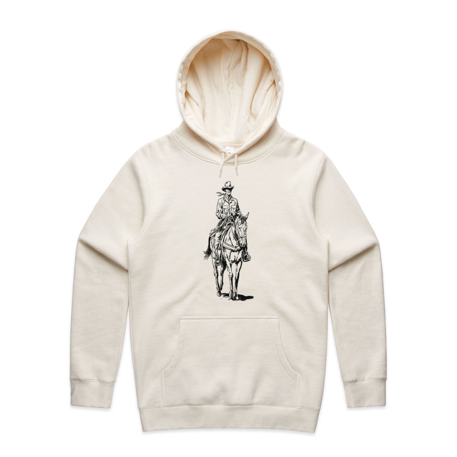 The black ink illustration is nothing short of epic, capturing the cowboy spirit like never before. Featuring classic pullover style, a cozy lined hood, and the ever-essential kangaroo pocket for all your bits and bobs. The tonal drawcord and ribbed cuffs add that extra bit of style, making this hoodie perfect for any adventure you might find yourself on.