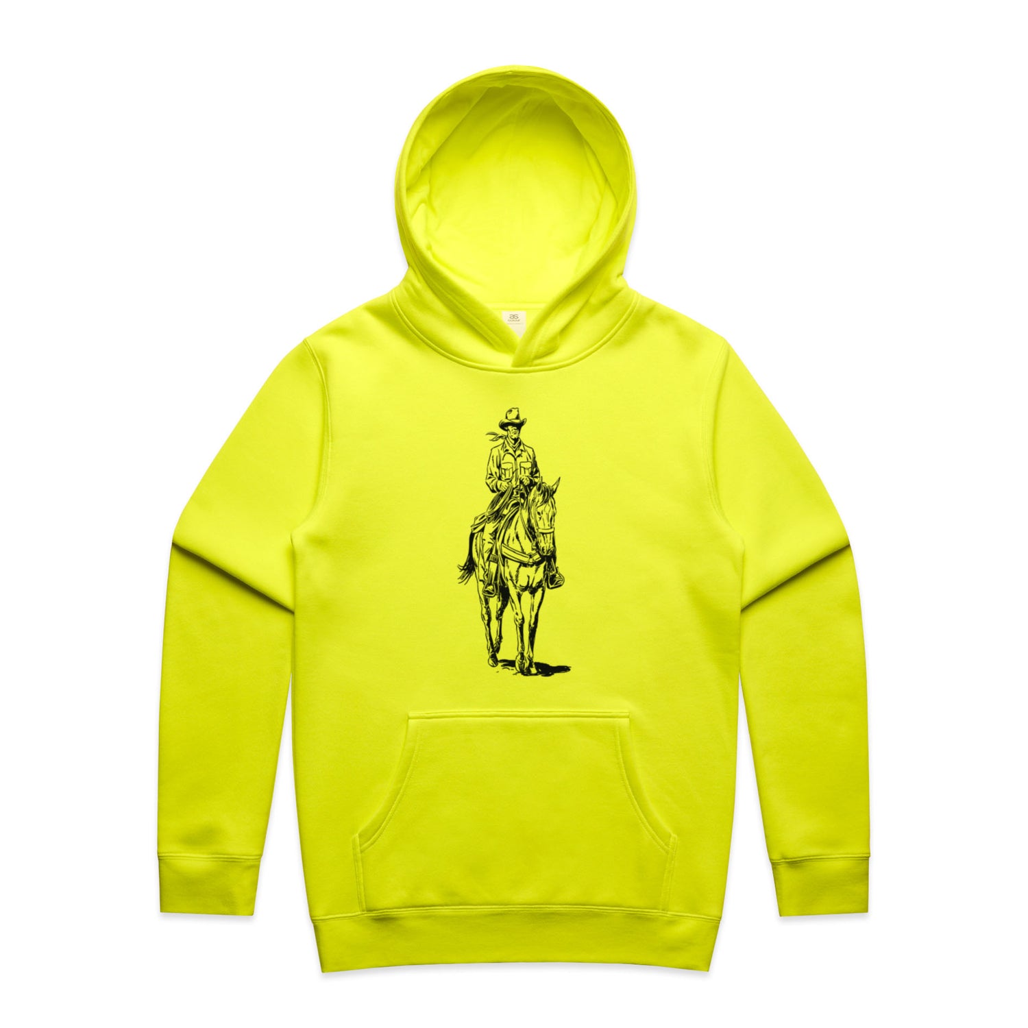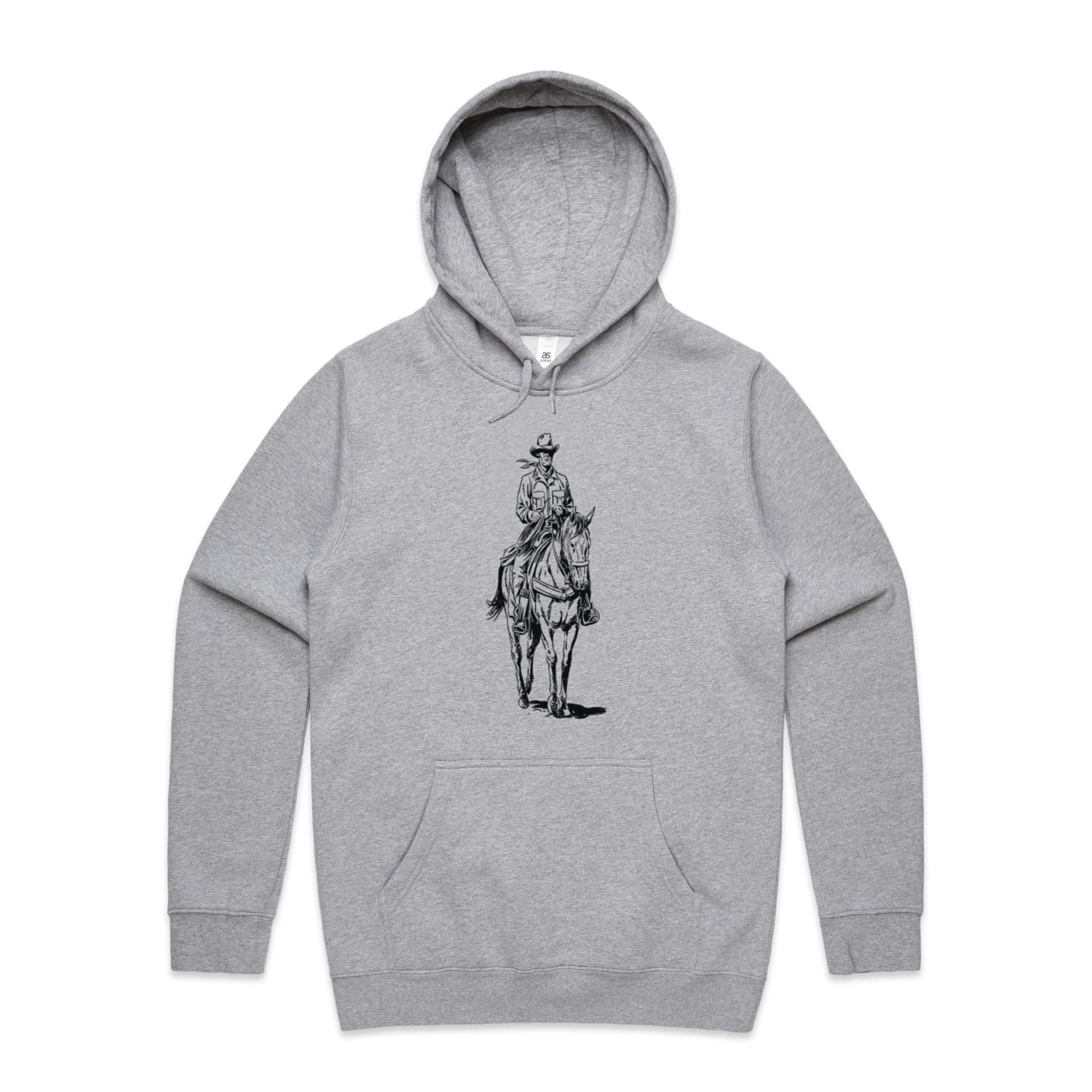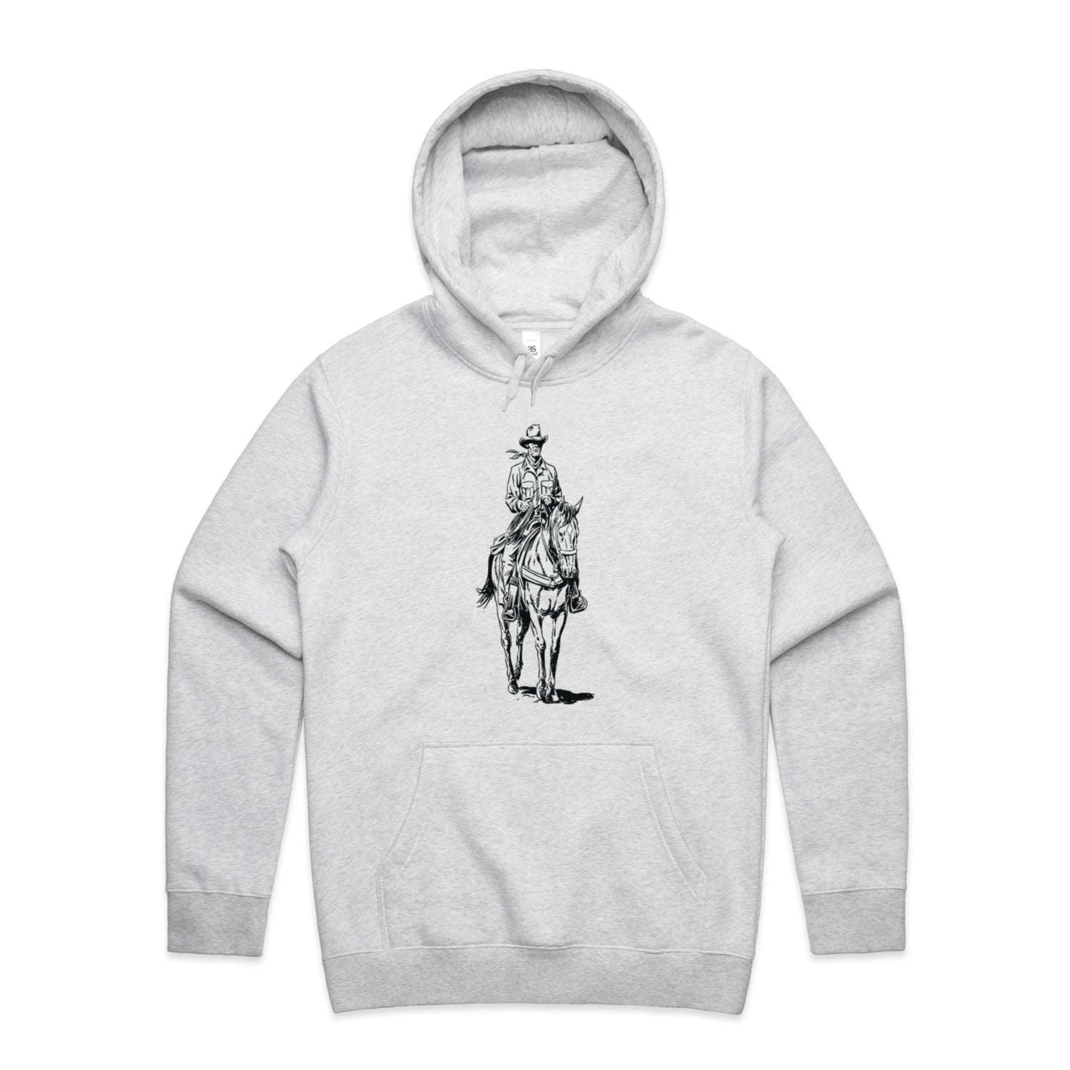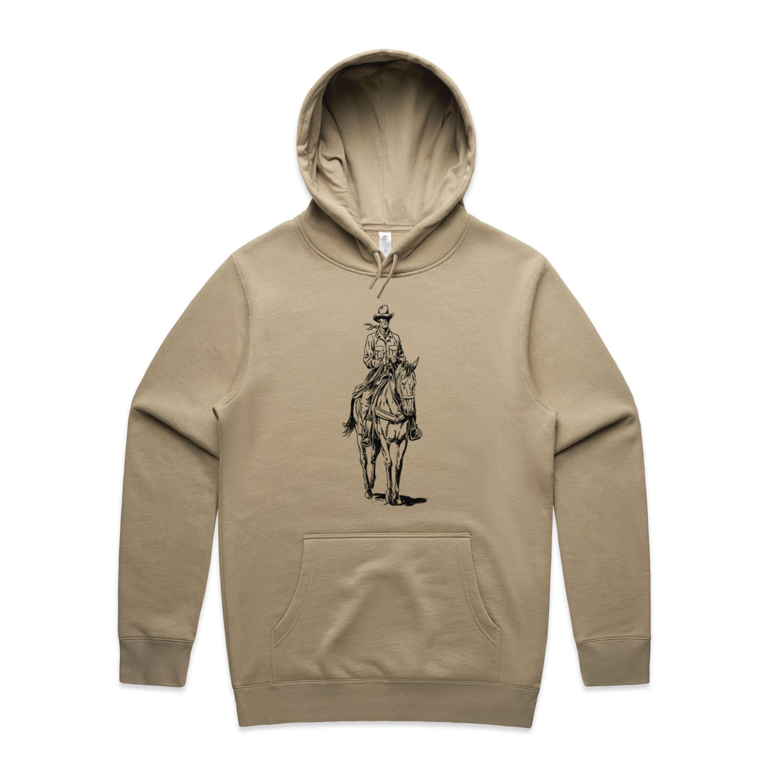 The black ink illustration is nothing short of epic, capturing the cowboy spirit like never before. Featuring classic pullover style, a cozy lined hood, and the ever-essential kangaroo pocket for all your bits and bobs. The tonal drawcord and ribbed cuffs add that extra bit of style, making this hoodie perfect for any adventure you might find yourself on.