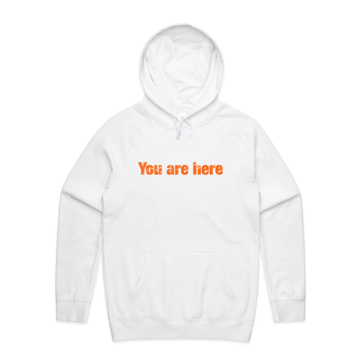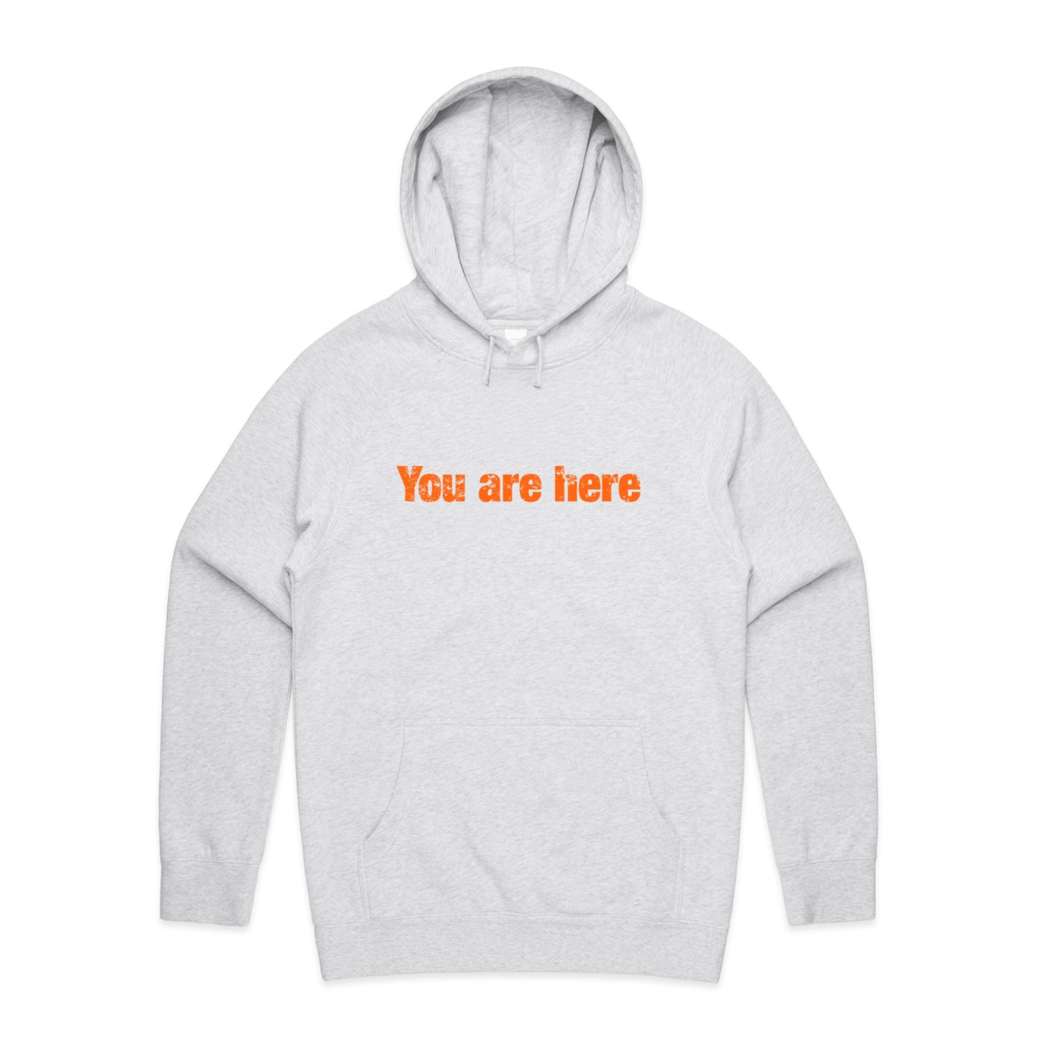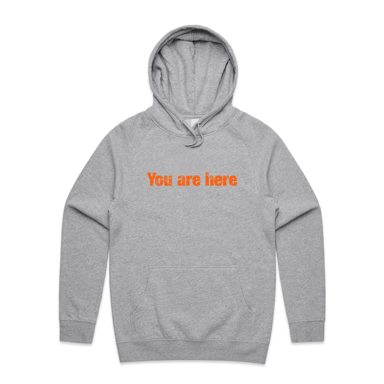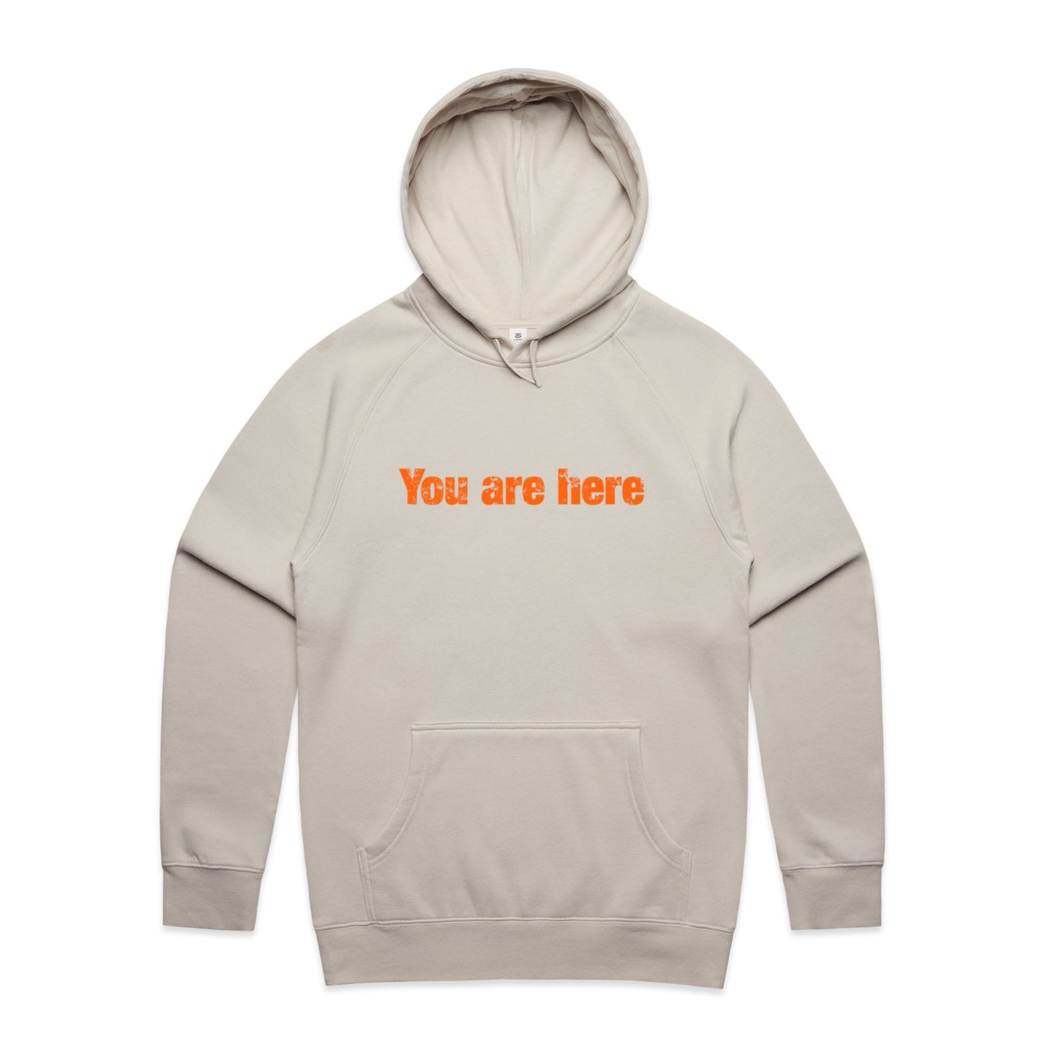 The Hoodies You are Here – Men's Hooded Sweatshirt is a high-quality men's hooded sweatshirt, printed with orange ink on the trusted AS Colour Supply Hood 5101. With a regular fit and mid-weight feel, it's crafted from a premium blend of 80% cotton and 20% polyester anti-pill fleece, making it a durable and comfortable staple for any wardrobe. The pullover design features raglan sleeves, a lined hood with tonal drawcord, ribbed sleeve cuffs, and a roomy kangaroo pocket — all designed to keep you warm while looking effortlessly sharp.