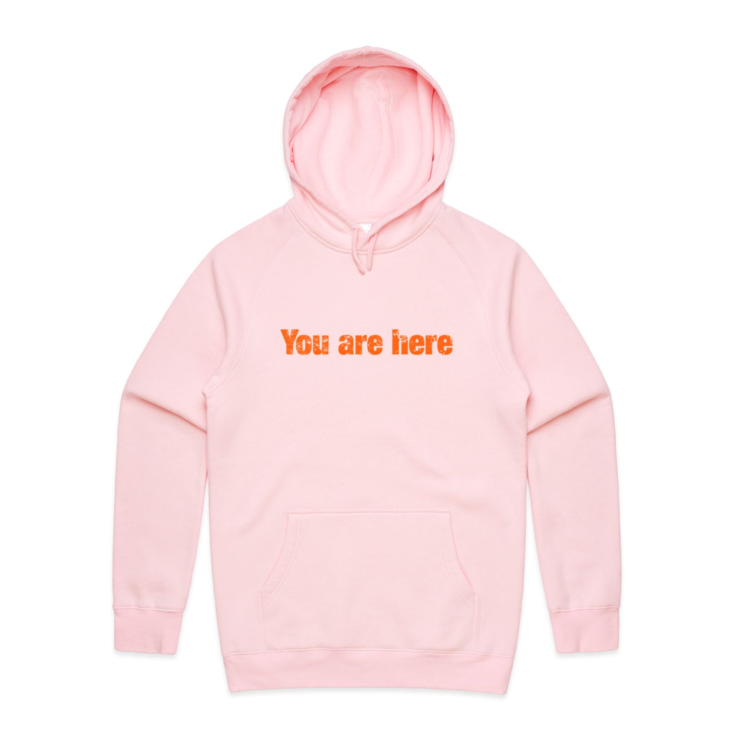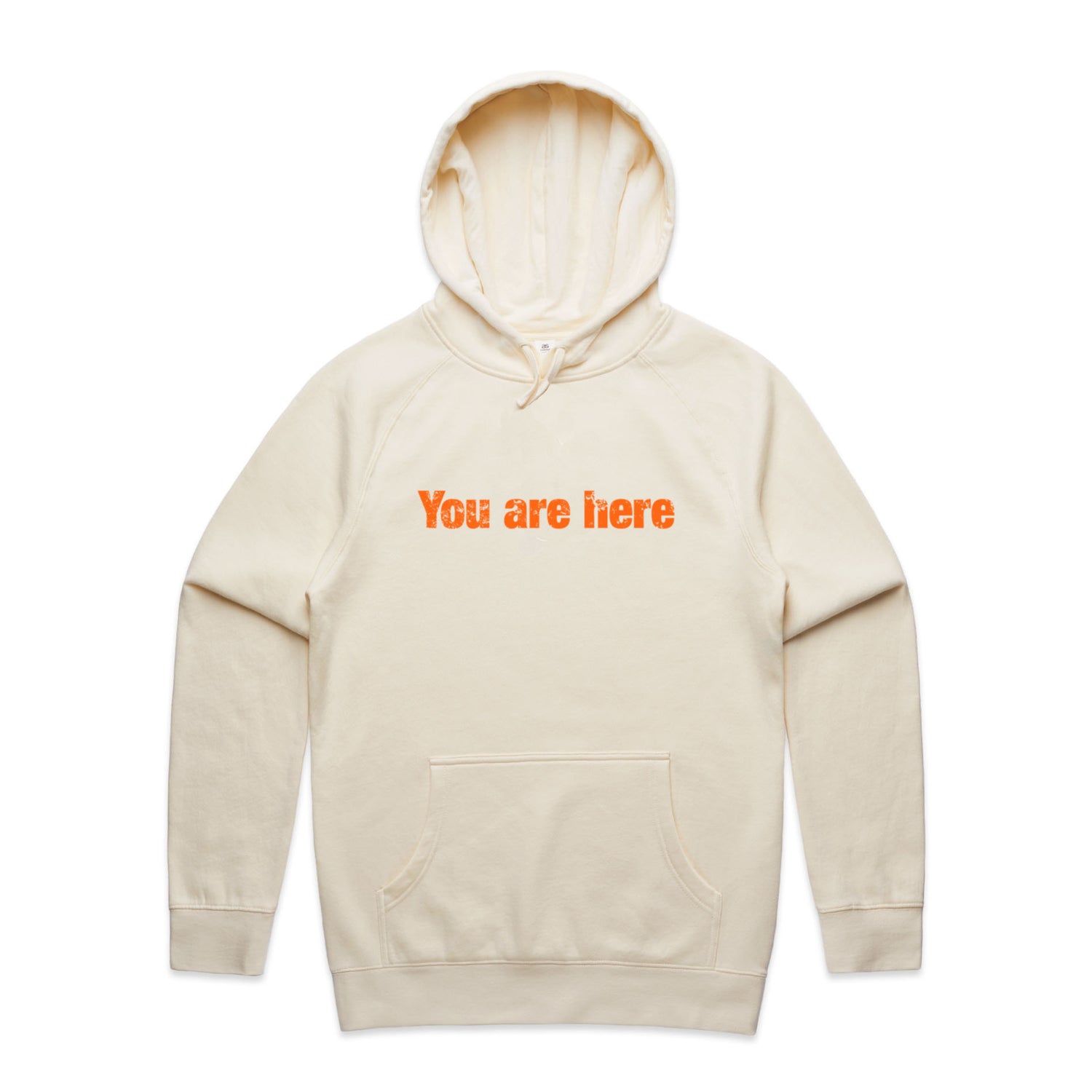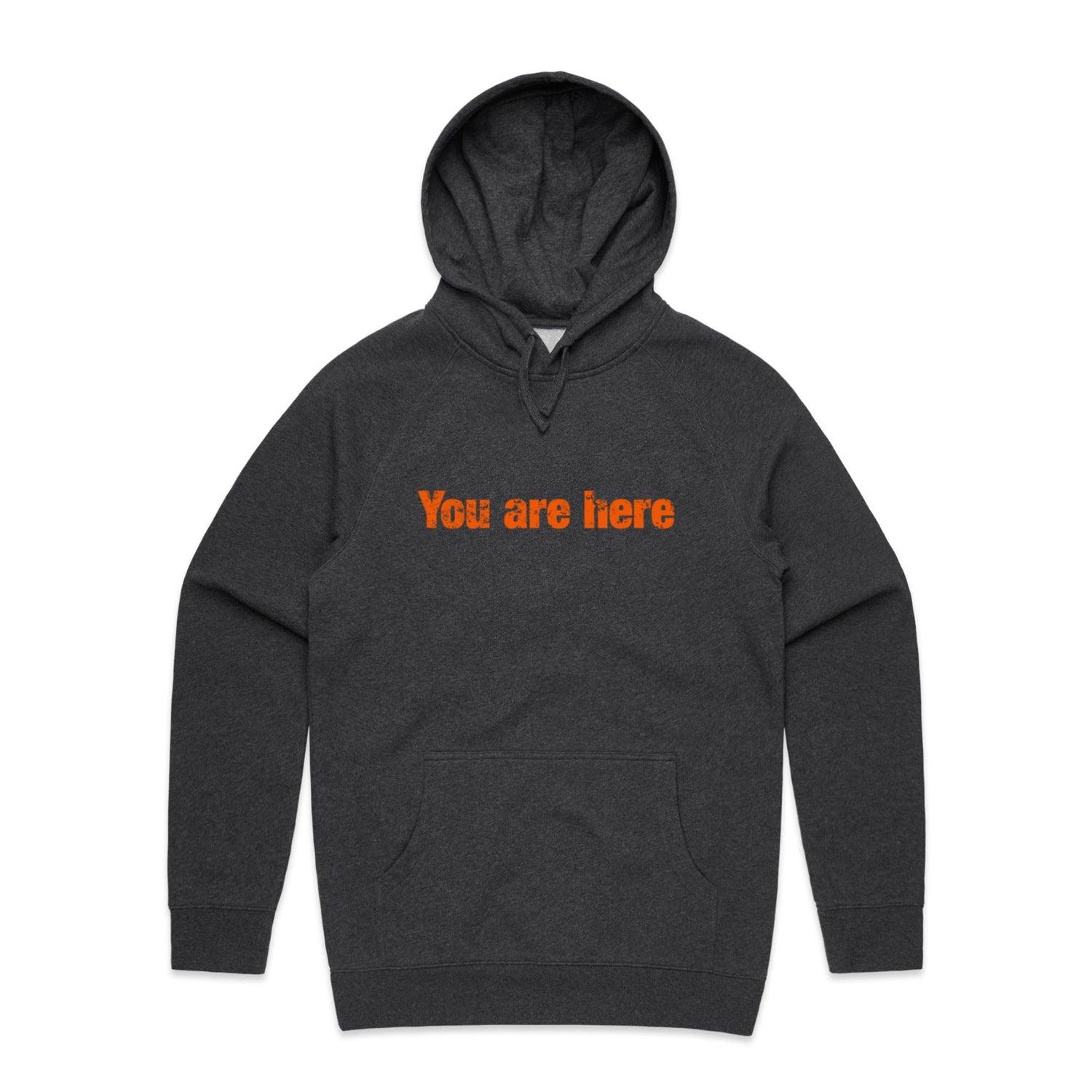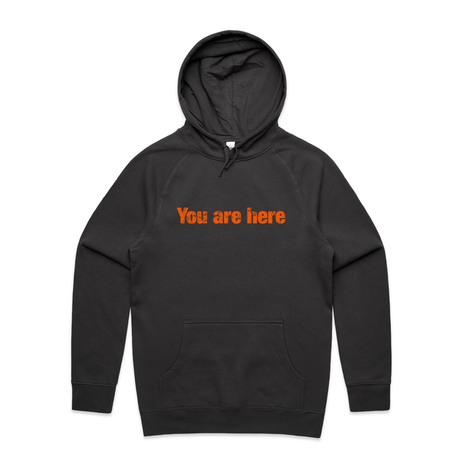 The Hoodies You are Here – Men's Hooded Sweatshirt is a high-quality men's hooded sweatshirt, printed with orange ink on the trusted AS Colour Supply Hood 5101. With a regular fit and mid-weight feel, it's crafted from a premium blend of 80% cotton and 20% polyester anti-pill fleece, making it a durable and comfortable staple for any wardrobe. The pullover design features raglan sleeves, a lined hood with tonal drawcord, ribbed sleeve cuffs, and a roomy kangaroo pocket — all designed to keep you warm while looking effortlessly sharp.